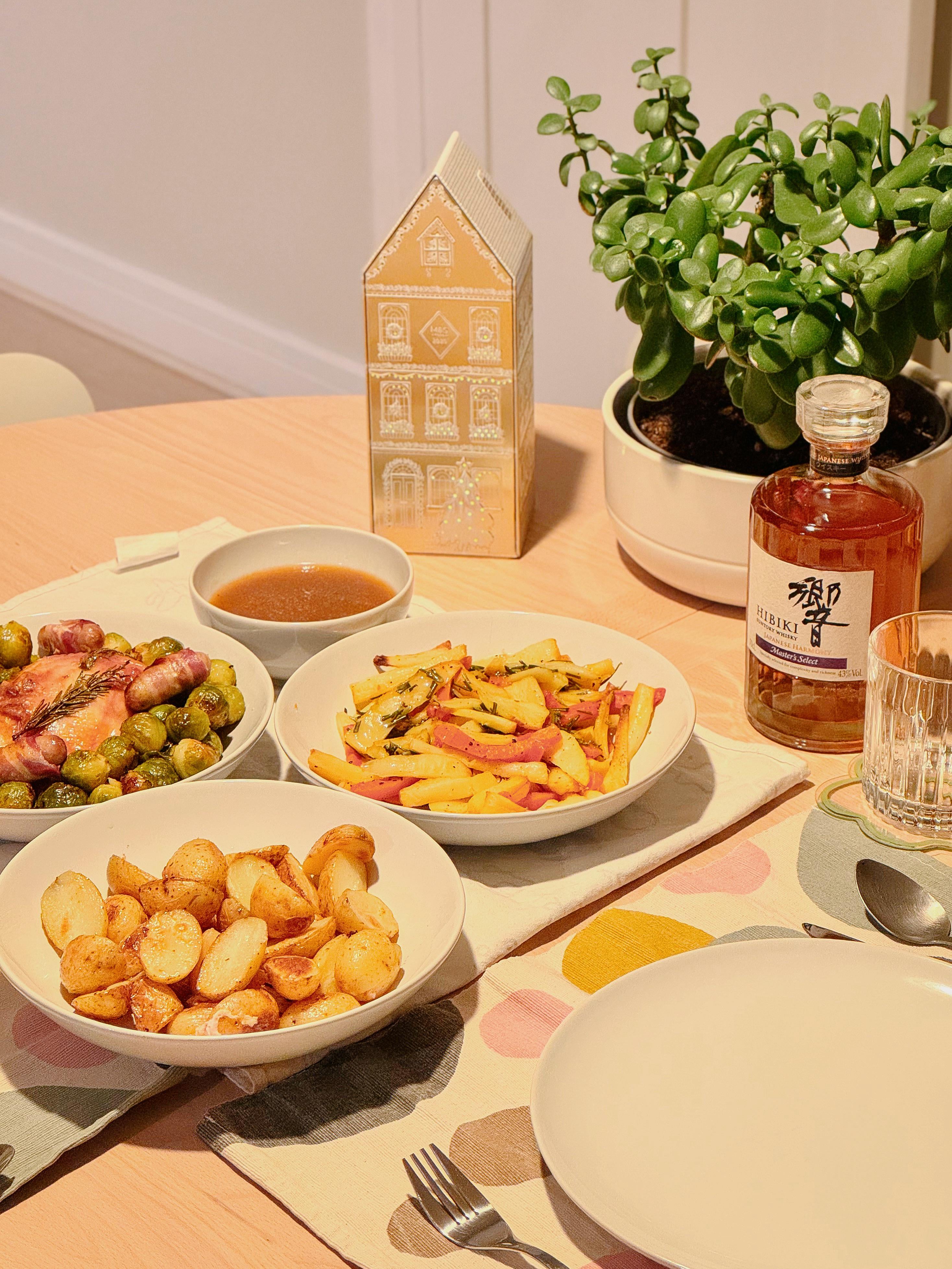 Just two of us. Turkey. Pig in a blanket. Parsnips and carrots in rosemary honey sauce. Brussel sprouts. Potatoes. Hibiki Whiskey. by Inevitable_North_962 Dinner Tonight Tonight's Dinner