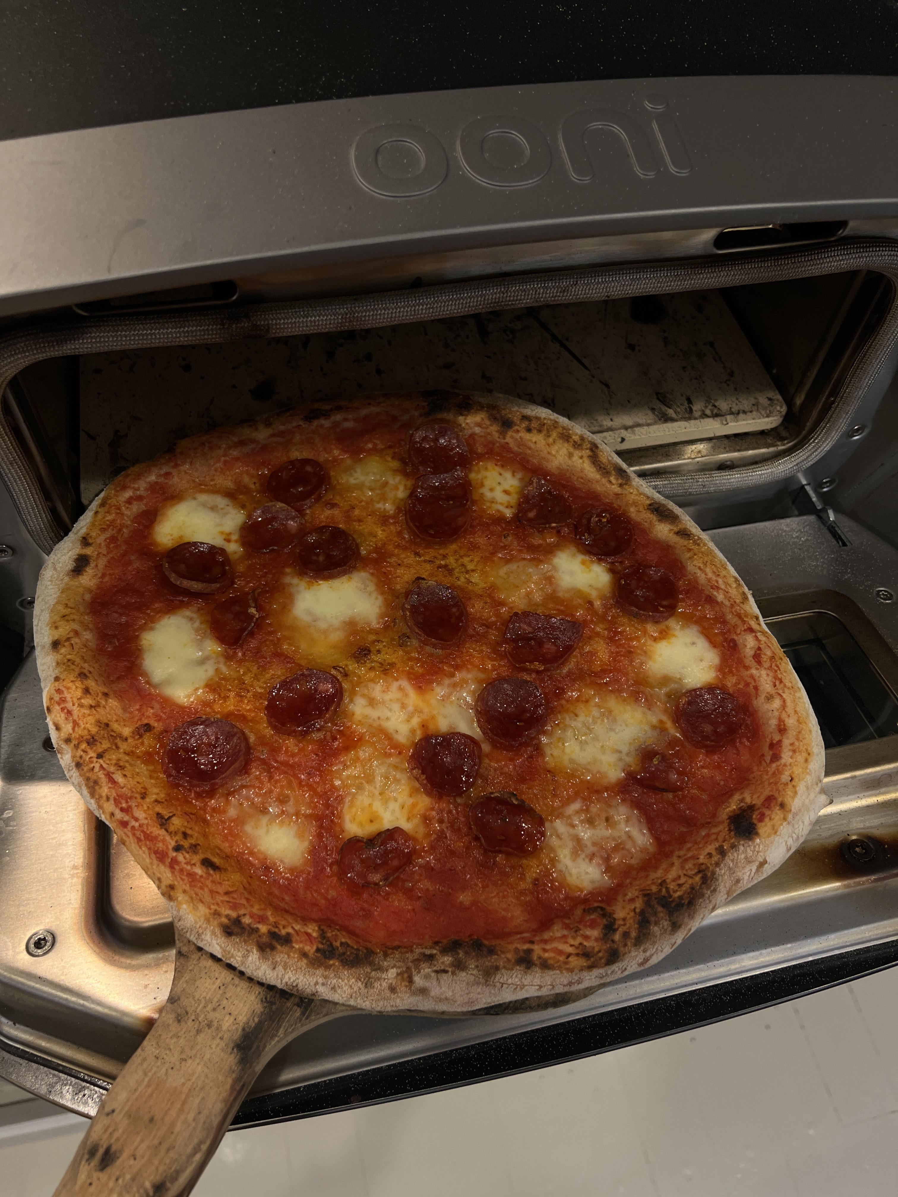 First pizza in my new Ooni (pepperoni + fresh mozzarella)