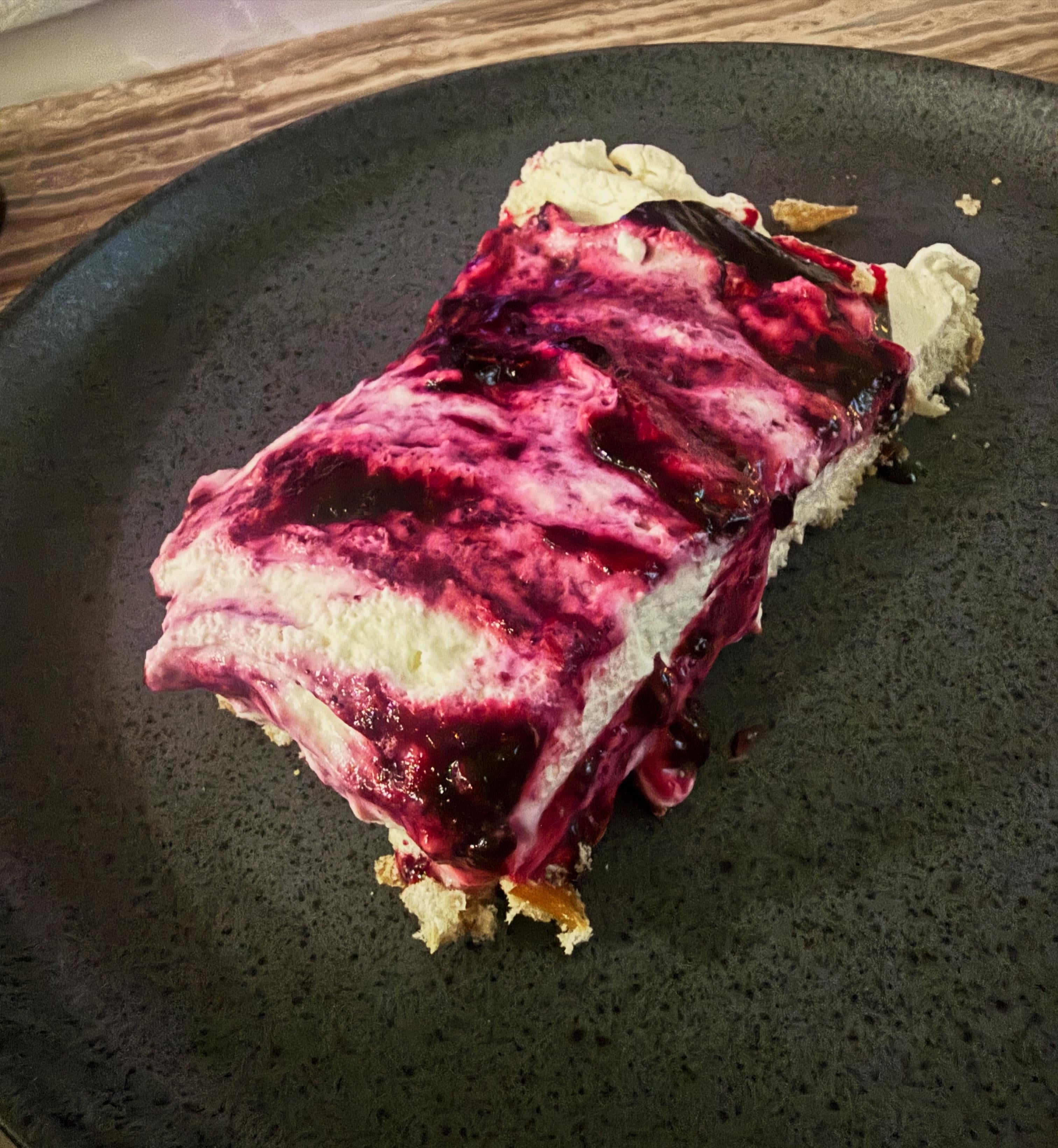 Lemon cheesecake and blueberry pavlova slice