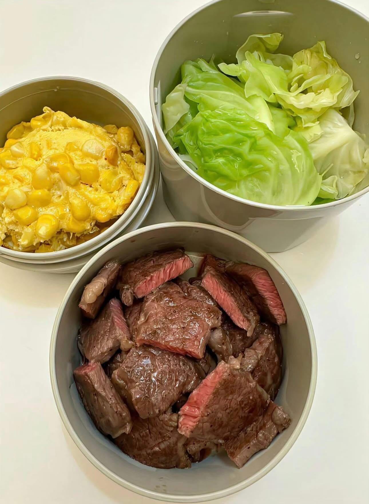 Home made Stir-Fry Beef, Baked Cheesy Corn and Boiled Cabbage.