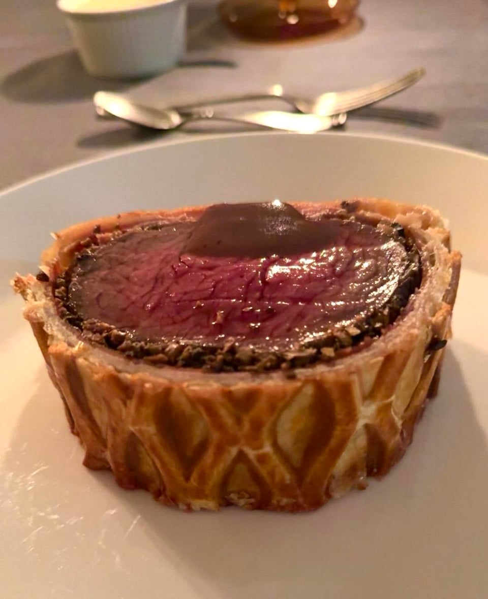 Pan Seared Pork Steak with Apple Cider Sauce and Caramelised Apples. Served with Gratin and Sautéed Brocolli. Finished with Crispy Sage Leaves.