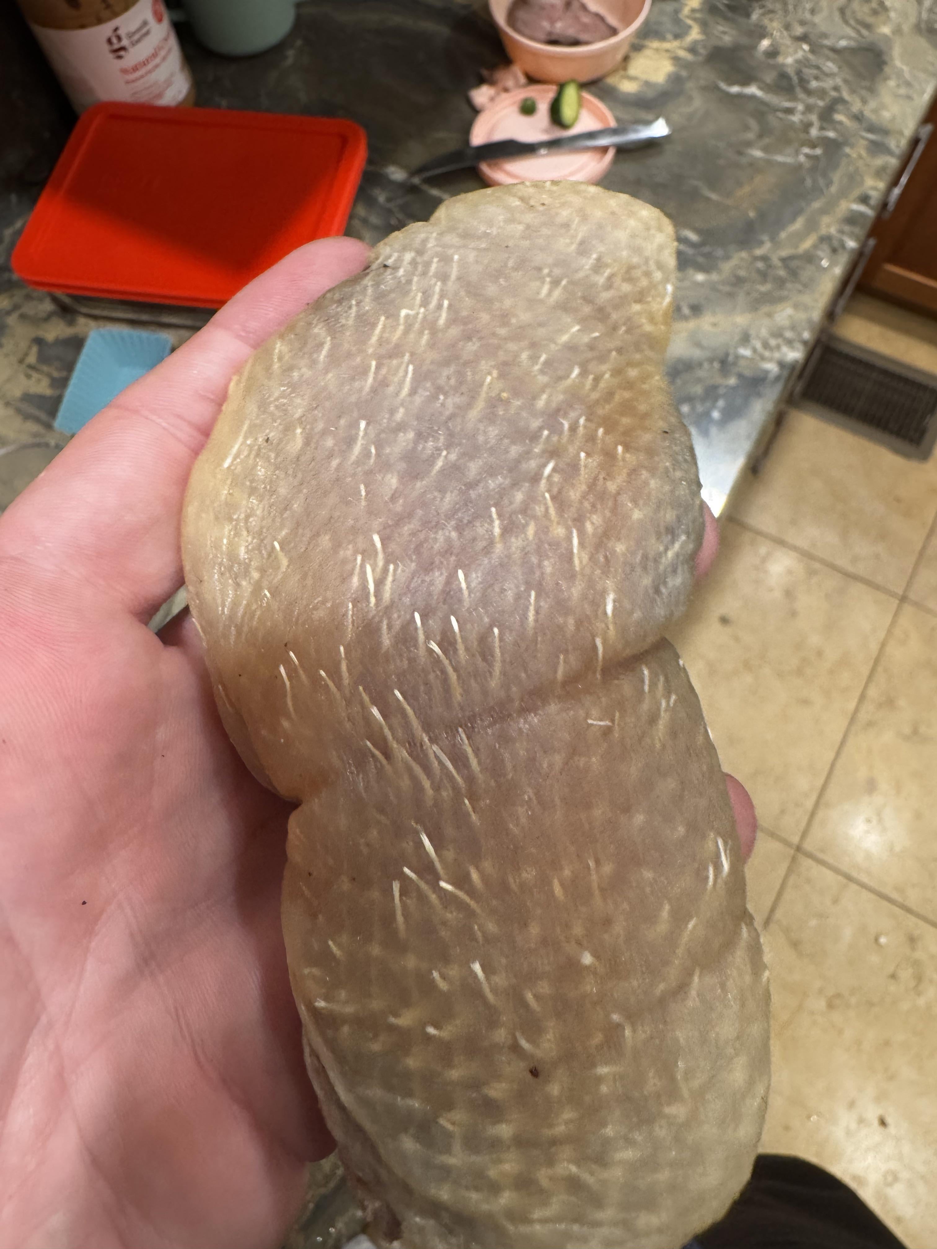 Calamus (feather connections). Ideally you would have plucked it earlier, you can still pluck it. Totally normal, and if you have one of those offset large grippy tweezers it’ll go fast.