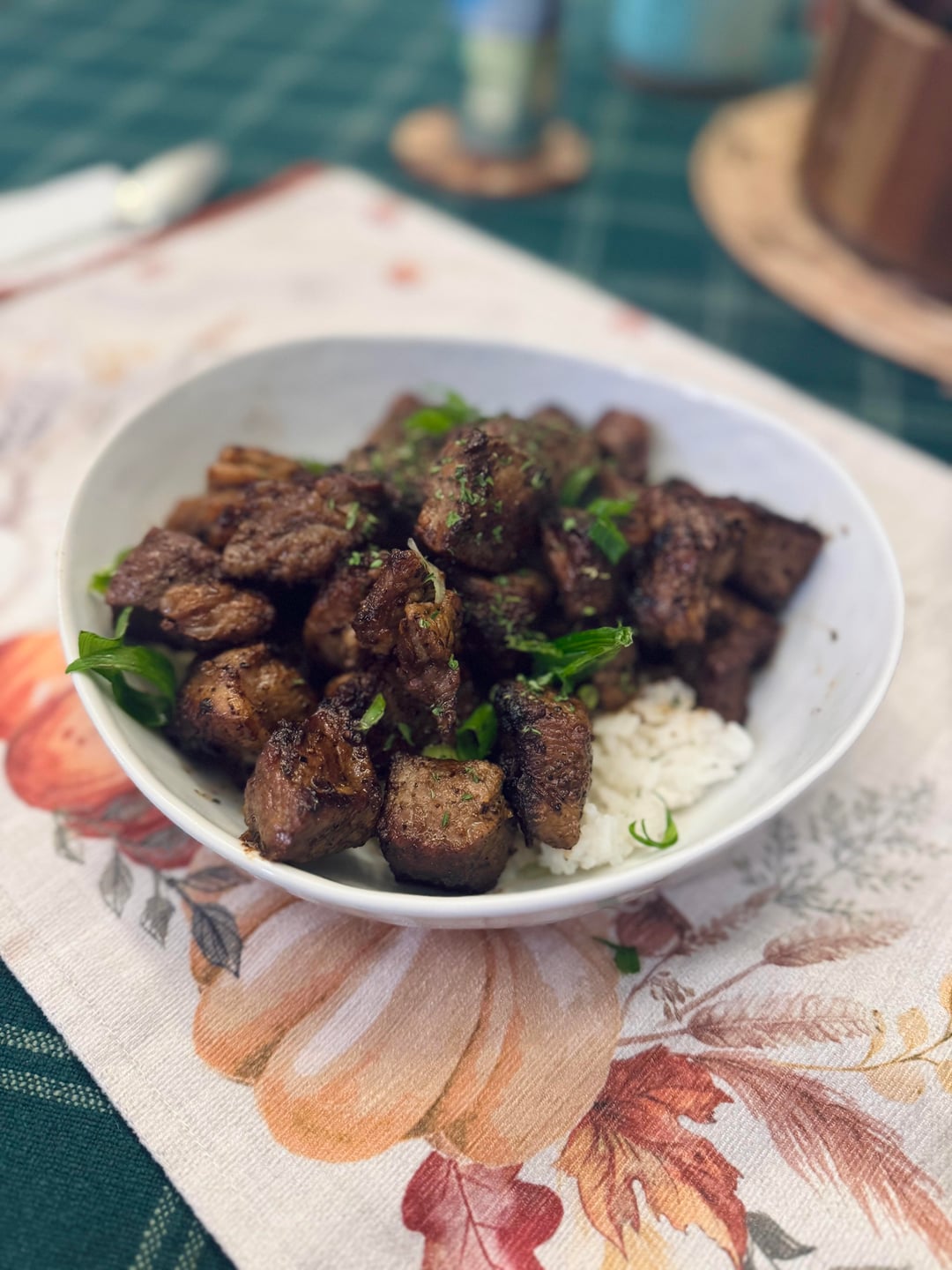 Photo 2 – Truffle and Garlic Steak bites with Rice (for my fiancé, who doesn’t like Gen. Tso’s)