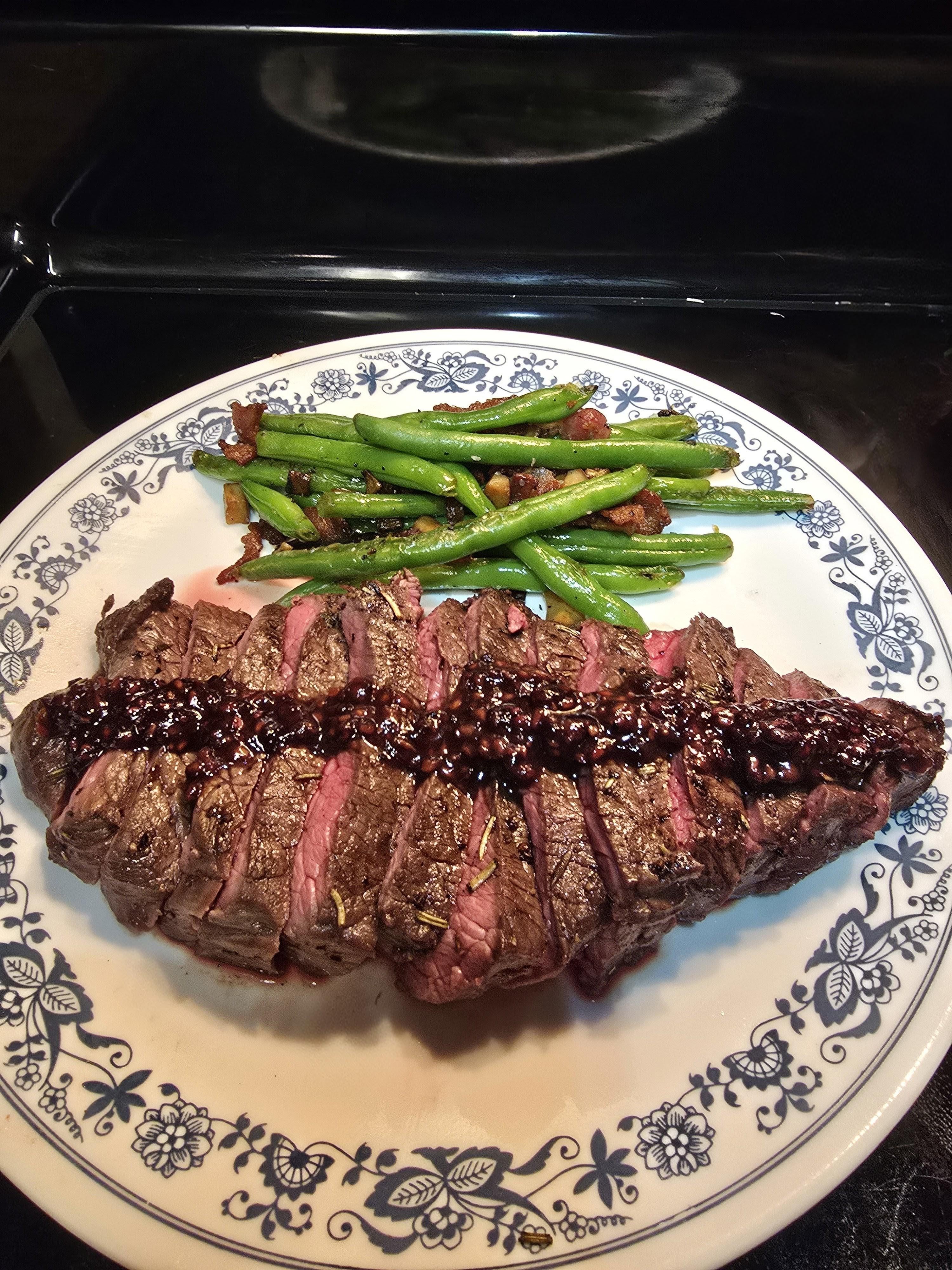 talloak34 on December 28, 2025 2:22 am Ingredients ​The Main Protein ​3 lbs Bison Steaks (5 portions) ​Rub: Salt, Black Pepper, Dried Rosemary ​Butter (for basting) ​Side Dish (“Confetti Hash”) ​12 oz Green Beans (chopped 1″) ​2 King Trumpet Mushrooms (diced) ​10 Slices Bacon (chopped raw) ​2 Cloves Garlic (minced) ​Note: Cooked in bacon fat for flavor ​Raspberry Reduction ​1 cup Raspberries (fresh/frozen) ​1/4 cup Balsamic Vinegar ​1/2 cup Beef Bone Broth ​1 sprig Rosemary ​Instructions ​1. Prepare the Confetti Hash ​Place chopped bacon in a cold skillet, turn heat to medium-high, and cook until crispy. ​Remove bacon but leave the fat in the pan. ​Toss diced mushrooms into the fat and brown them. ​Add chopped green beans and garlic; sauté for 3–5 minutes until tender-crisp. ​Stir the bacon back in and set aside. ​2. Reverse Sear the Bison ​Season steaks heavily with salt, pepper, and rosemary. ​Place in the oven at 200^F for approximately 40 minutes, then remove. ​Heat a cast iron skillet until smoking hot. ​Sear steaks for 1 minute per side, adding butter and basting continuously to form a dark crust. ​3. Make the Raspberry Glaze ​Using the same skillet (with the browned butter and fond), add balsamic and broth to deglaze. ​Add raspberries and rosemary. ​Simmer for 5–6 minutes until thickened (the basting butter makes the sauce extra rich). ​4. Assembly ​Divide the Confetti Hash into 5 meal prep containers. ​Slice the Bison and place it next to the side dish. ​Pour the Raspberry Glaze over the meat.