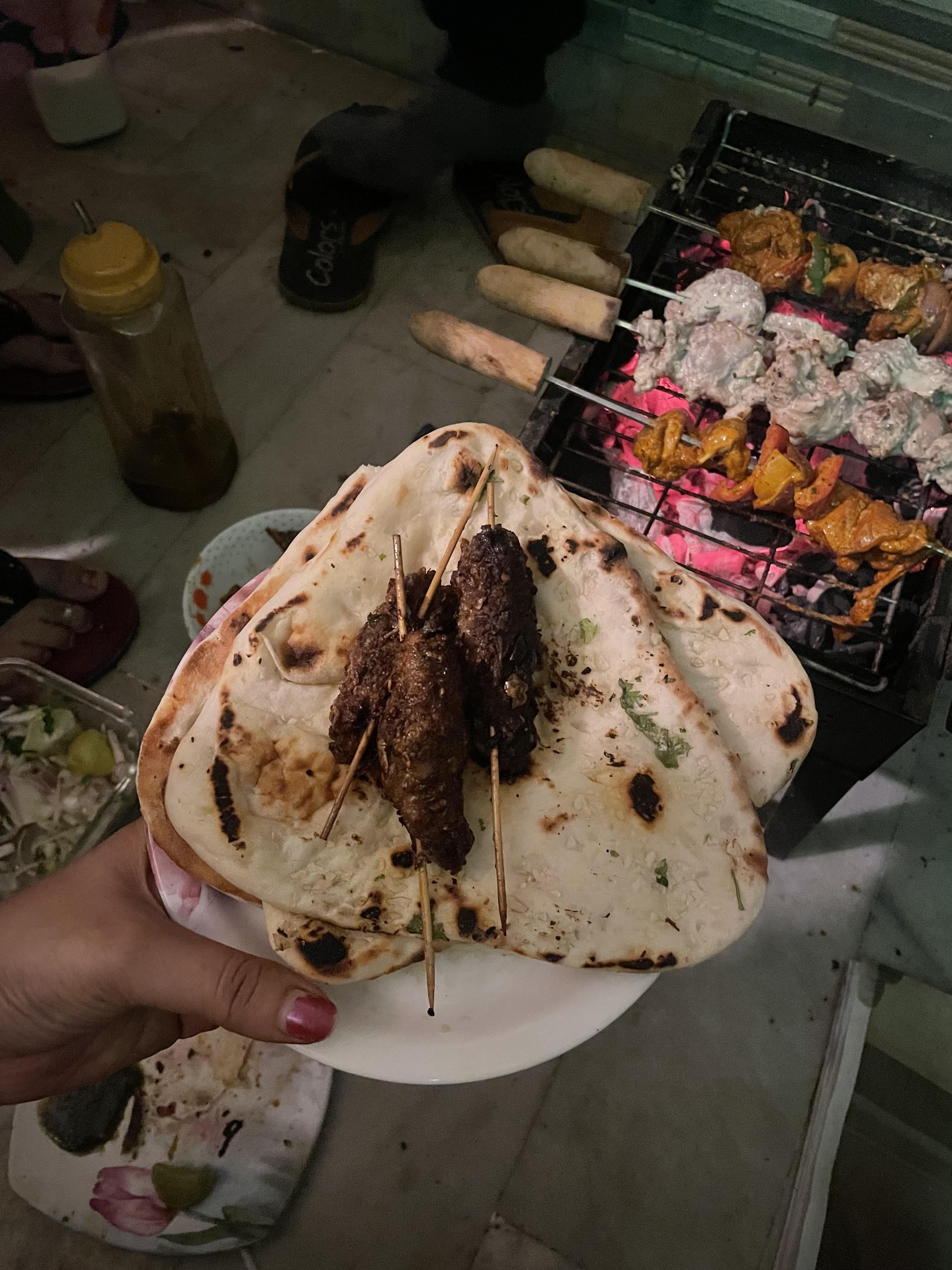 Mutton seekh with garlic naan, tandoori chicken and malai chicken on grill [homemade]