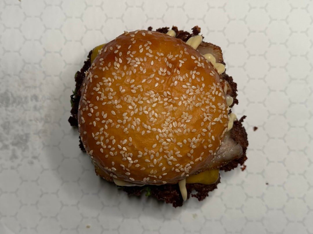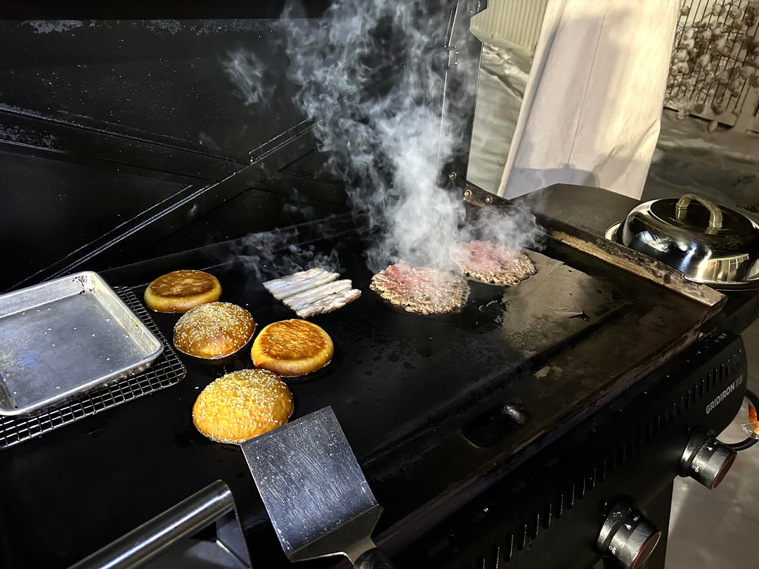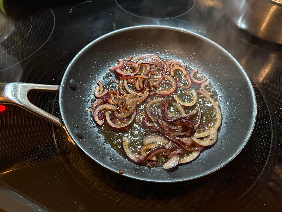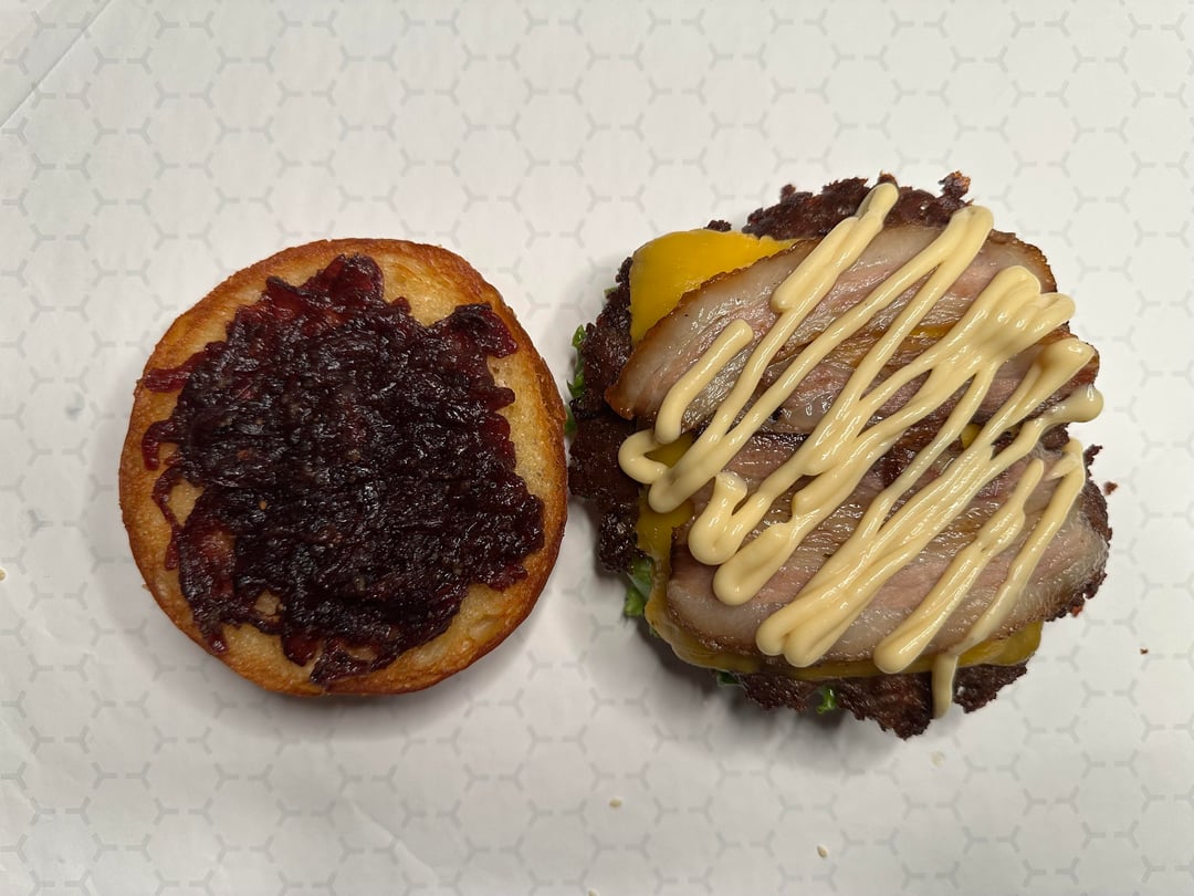 Burger night! This week’s special had Home ground chuck smash patties, American cheese, a quick sweet and spicy red onion jam (red onions cooked with my maple jalapeño sauce), lettuce, pickles, pork belly, and my maple Mustard lime sauce. My wife’s had lettuce, tomato, pickles, and the same sauce.