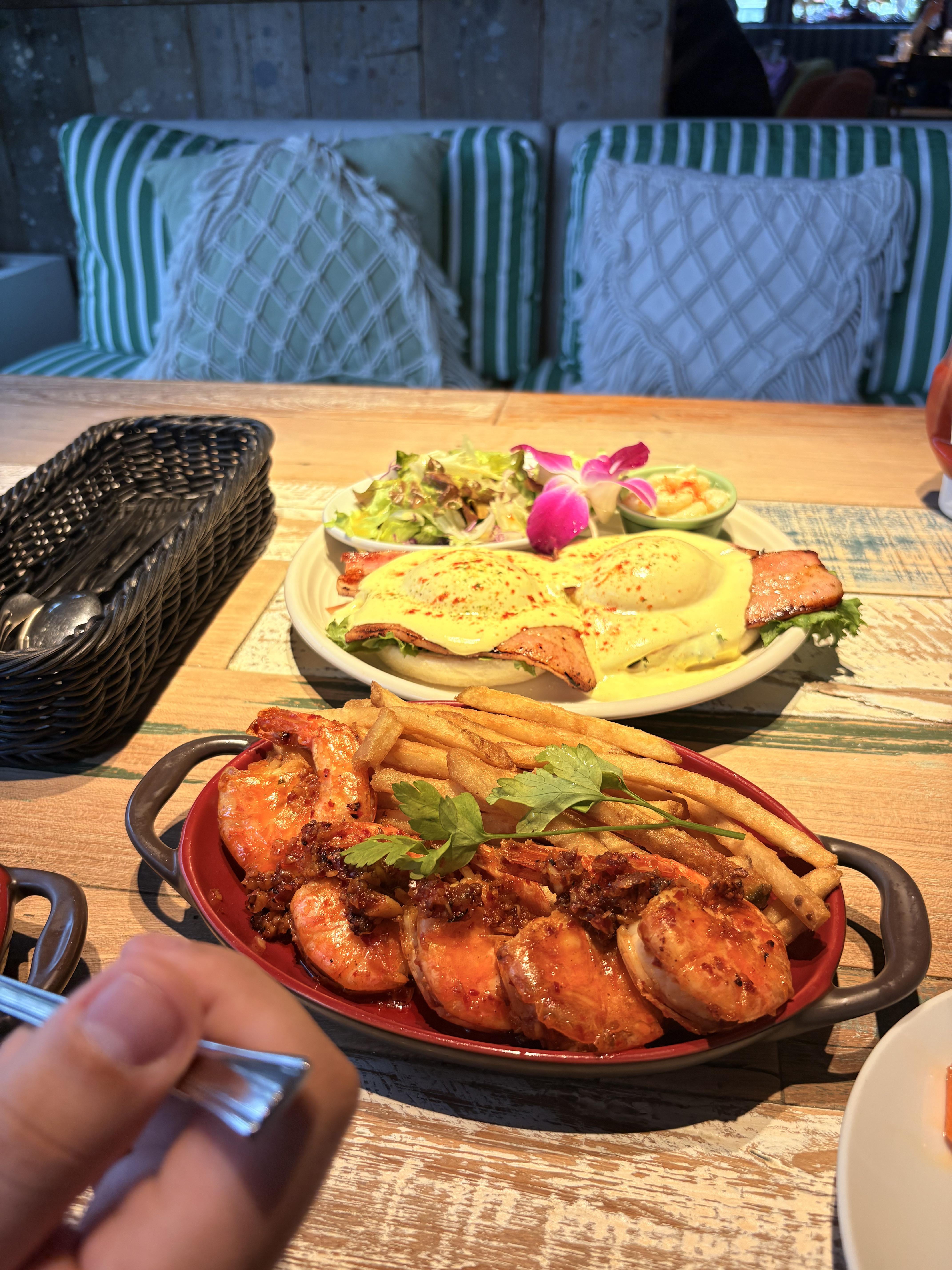 [i ate] garlic shrimp and eggs Benedict
