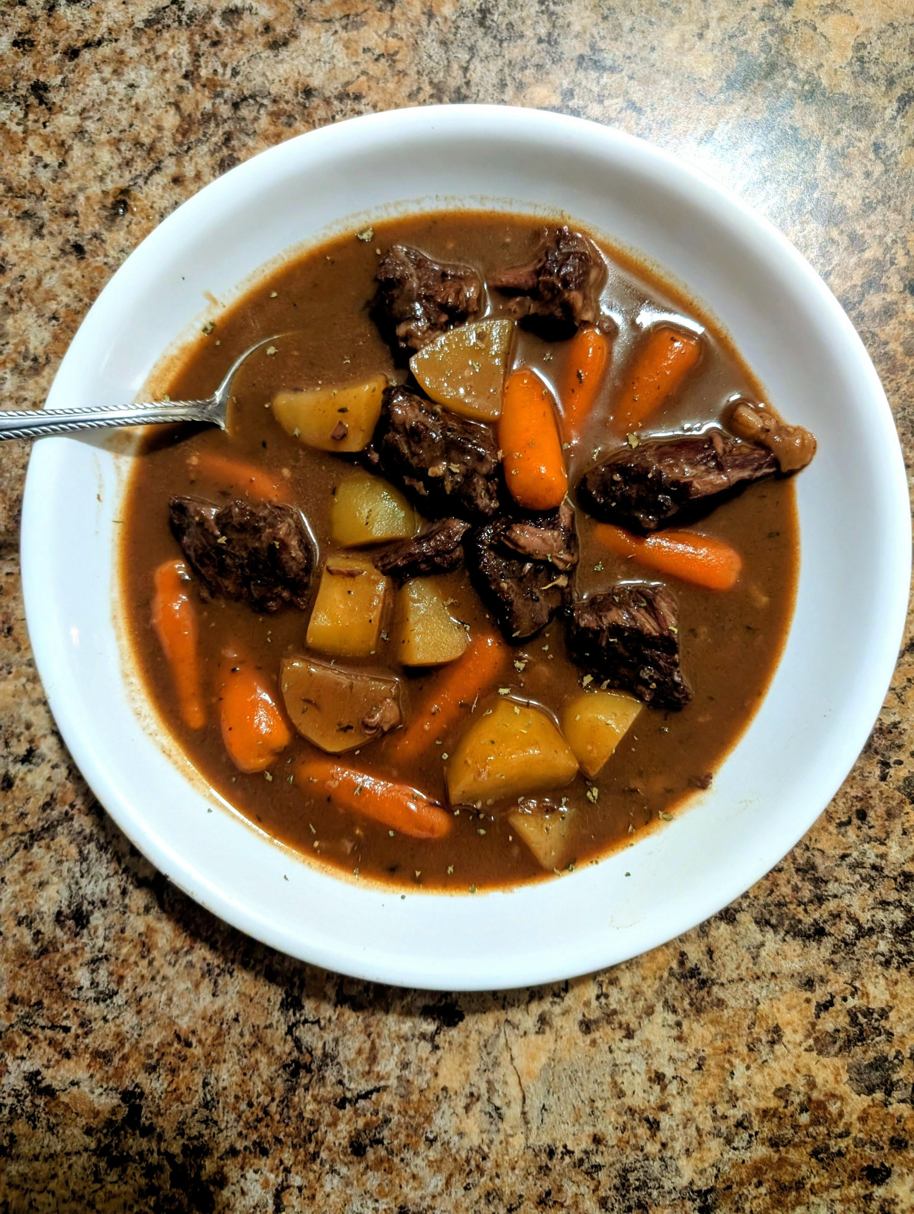 Beef stew with a red wine based broth. Simple yet delicious. Not pictured, a couple pieces of fresh sourdough bread that I used to mop up the bowl. by reds2433 Food