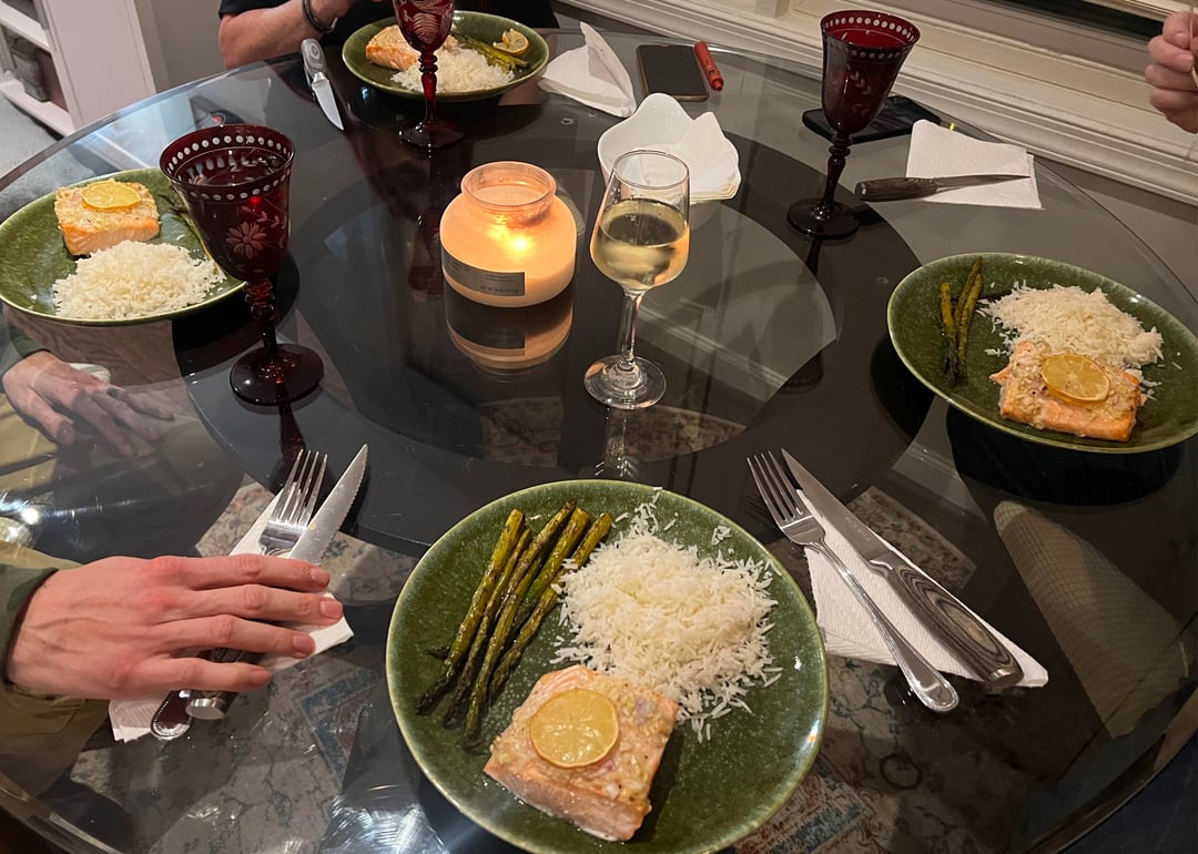 Last dinner with my fam before they head to the airport. Lovely Christmas 🥰. I made salmon with asparagus and rice for dinner. For dessert I combined one pack of Open Nature GF vanilla mix, 2TBSP of Nutella, and a 1/4-1/2 cup of choc chips. So good. I’ll sure miss everyone ðŸ˜.