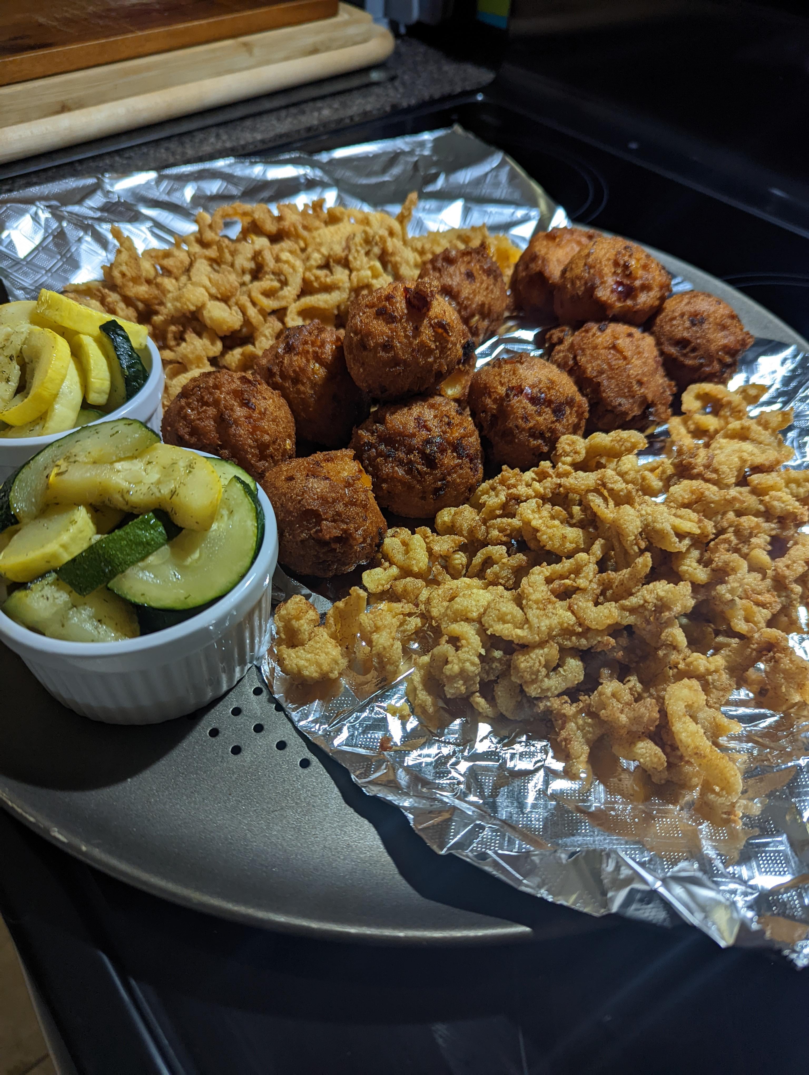 Fried clam strips and hush puppies with cocktail, remoulade, tartar, ketchup, mustard and mayonnaise as dipping sauces by laterdude Appetizer Appetizers