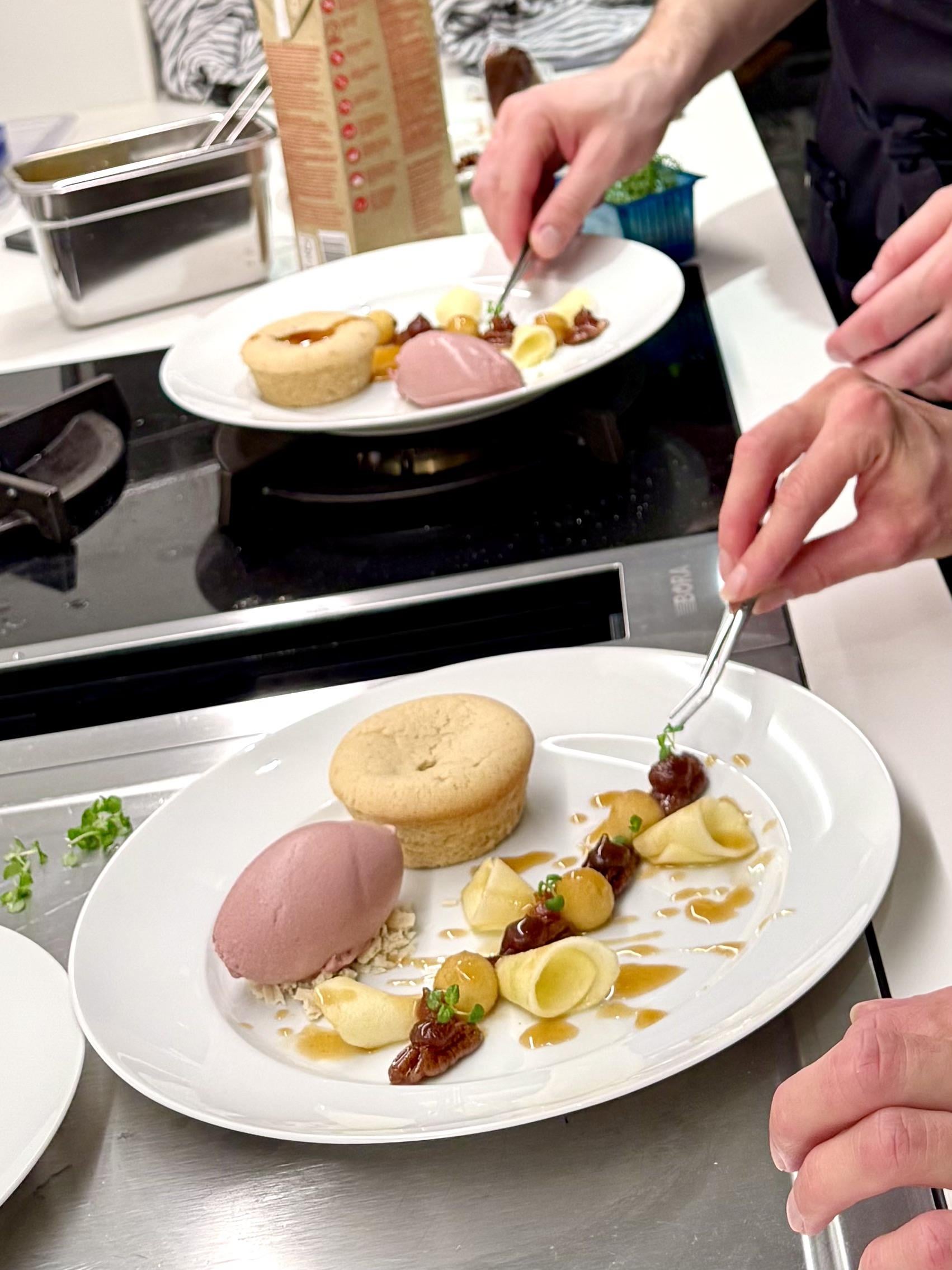 Speculaas mini cake with custard filling, caramelized pecans, apple funnel and apple spheres with caramel sauce, baked apple gel and red wine ice cream