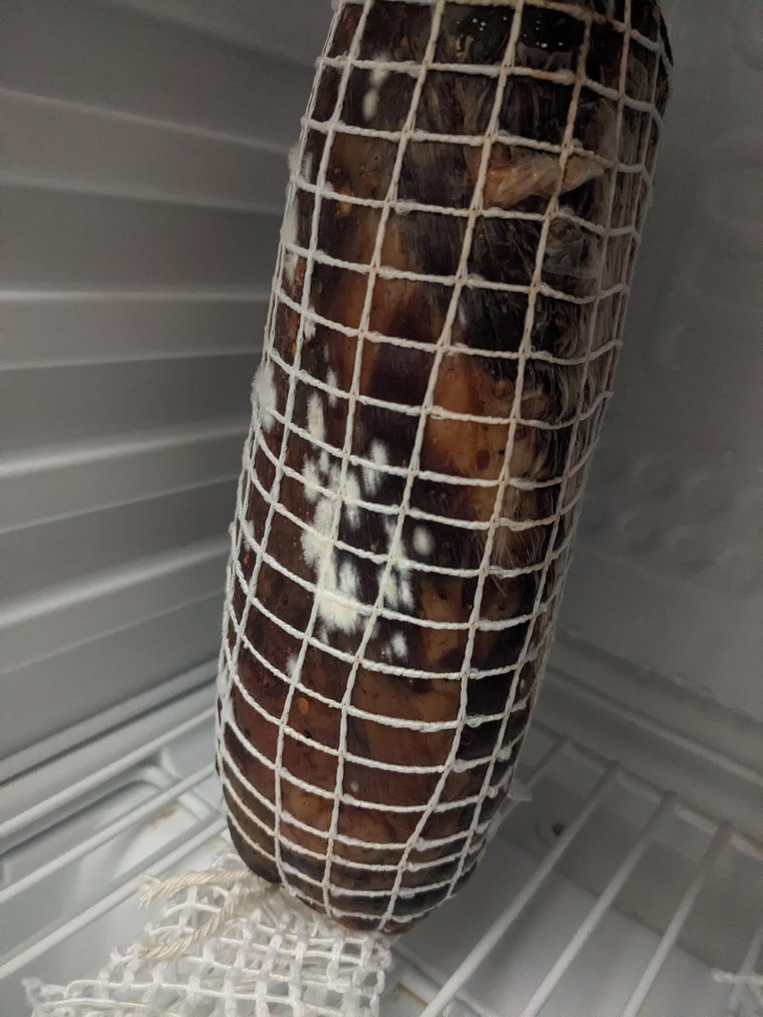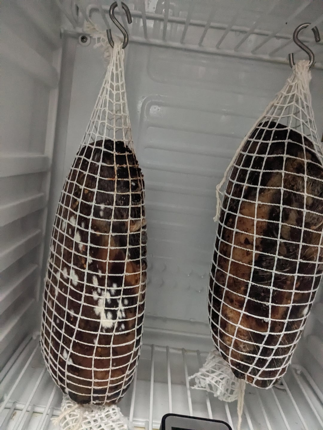 This time around the mold appeared into the second week of drying. The chamber ranges from 75-82 humidity @ 45-48°F, and I have a fan that runs every 3 hours for 15mins for air circulation.