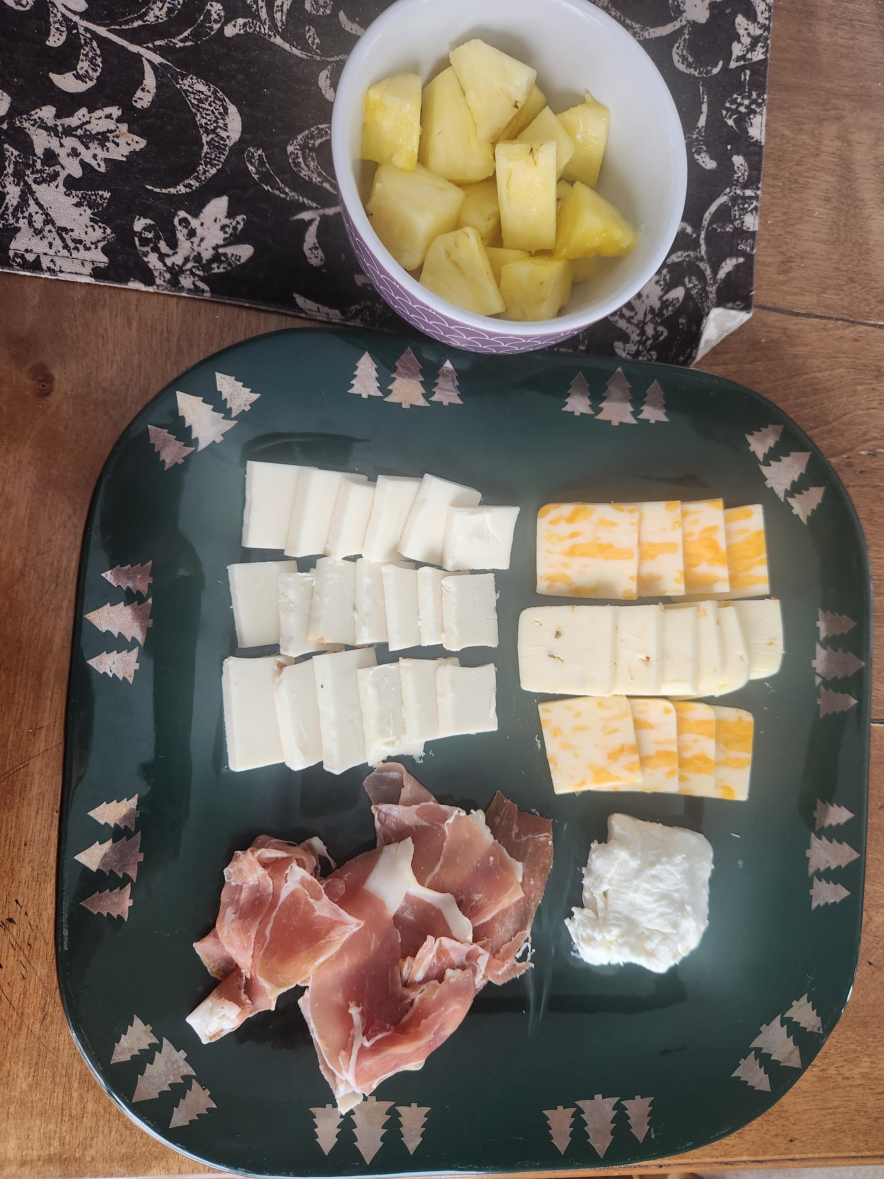 Pineapple, gouda, col-jack, pepper jack, prosciutto, honey goat cheese. by mashed_potato_auntie Charcuterie Charcuterie Board