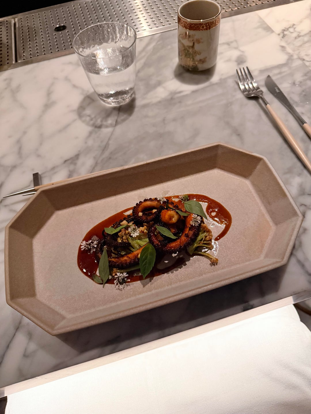 Super tender and crispy octopus legs. The sauce was a spicy Szechuan sauce and paired amazingly with the octopus. The drink pairing though definitely did not go well with the dish in my opinion. It was a spicy dish with an earthy, red date hot drink (which was served almost 15 mins before the actual dish…).