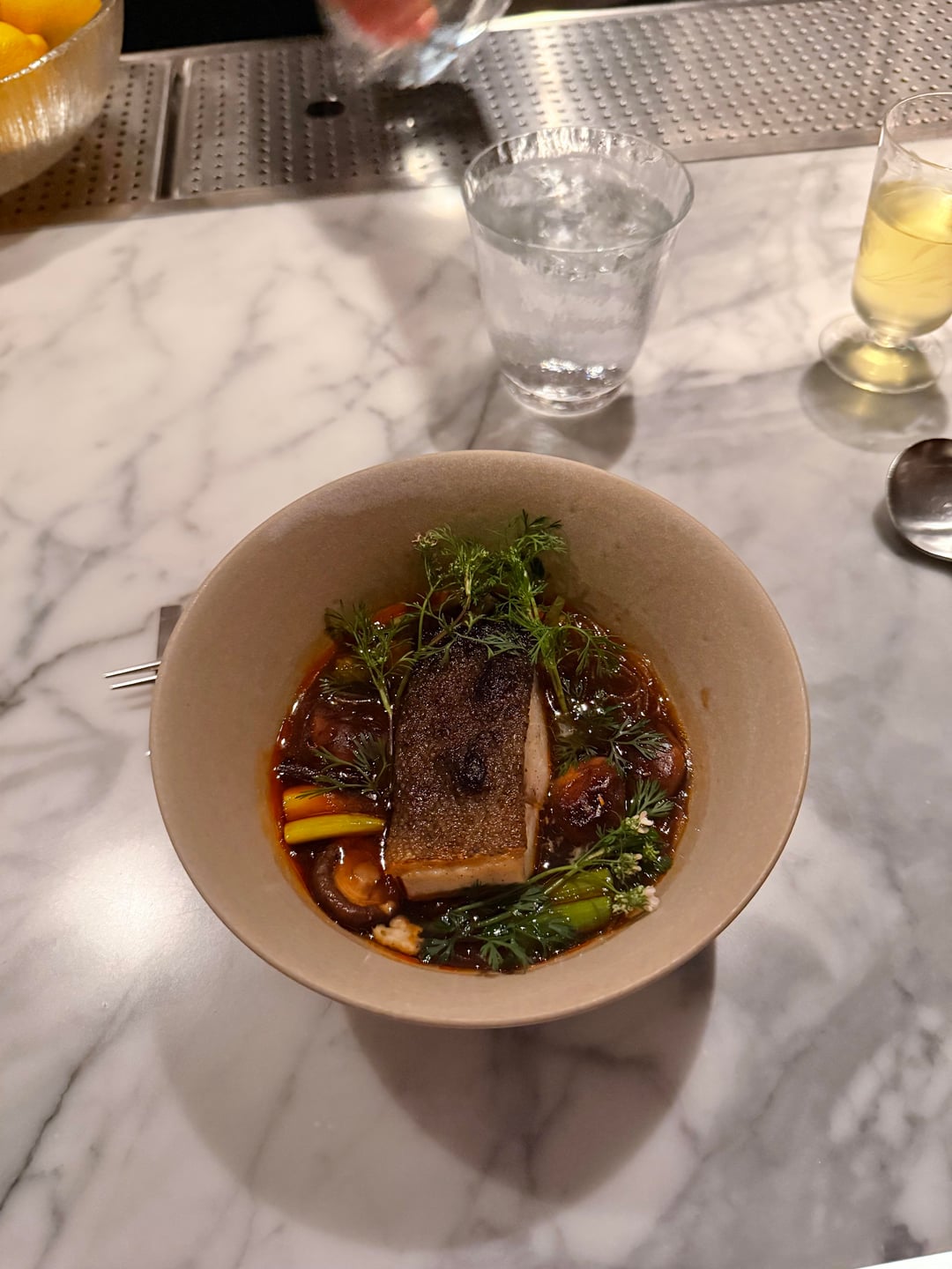 The sablefish/cod skin was poached with oil separately which made it have a nice crunch while the fish itself was extremely tender. The soup reminded me of a super clean, premium 牛肉麵(beef noodle soup) and had vermicelli and other veggies inside. It had a slight spice but it wasn’t overwhelming at all. The pairing helped cool down the spice as well!