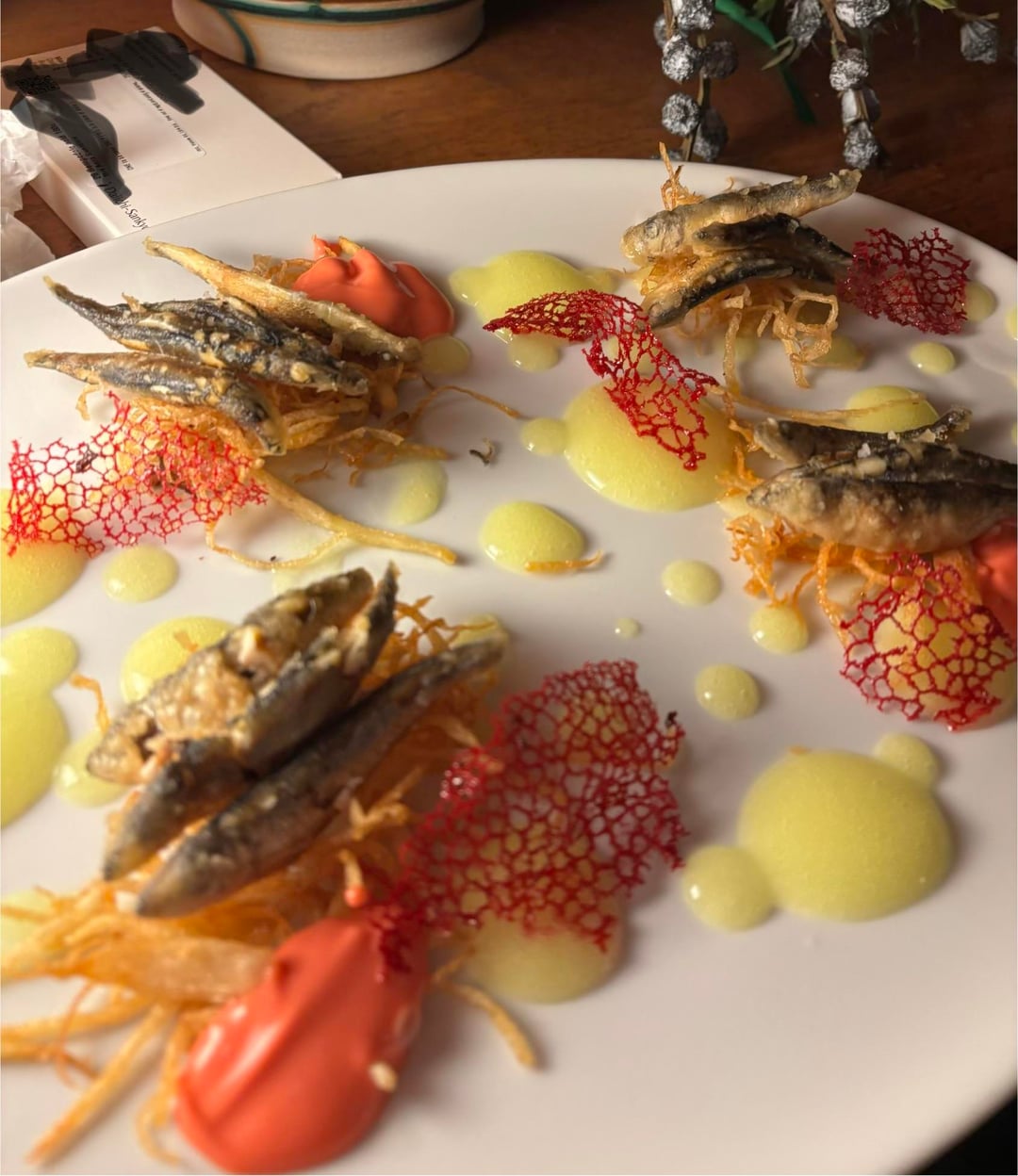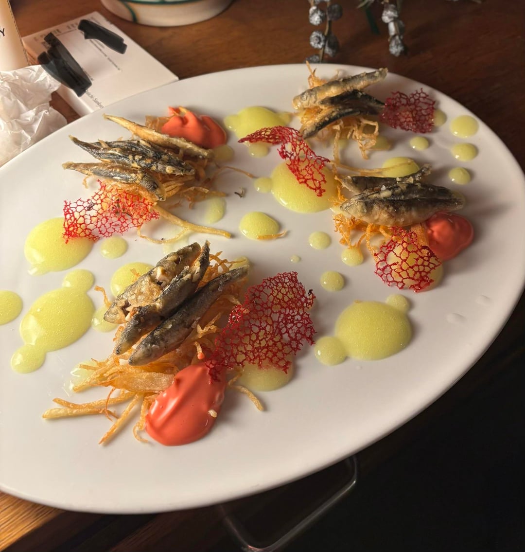 I think I’d tend towards a single one of your piles centrally (if it were me) and go bigger and serve maybe fried sardines instead of whitebait to scale up the size of the dish appropriately…