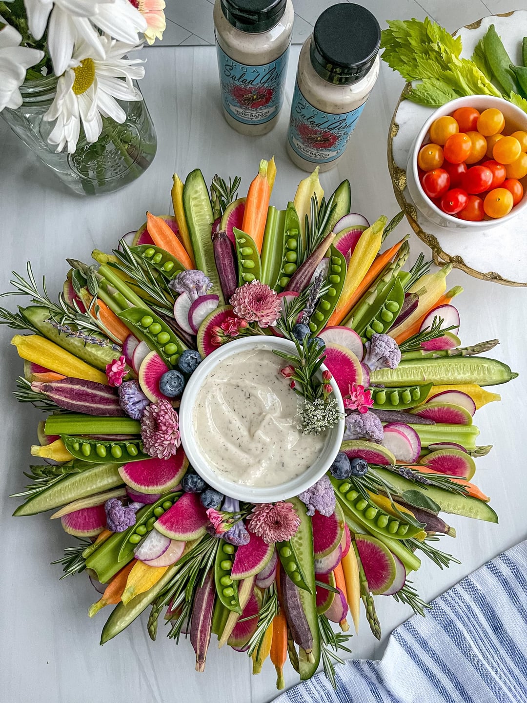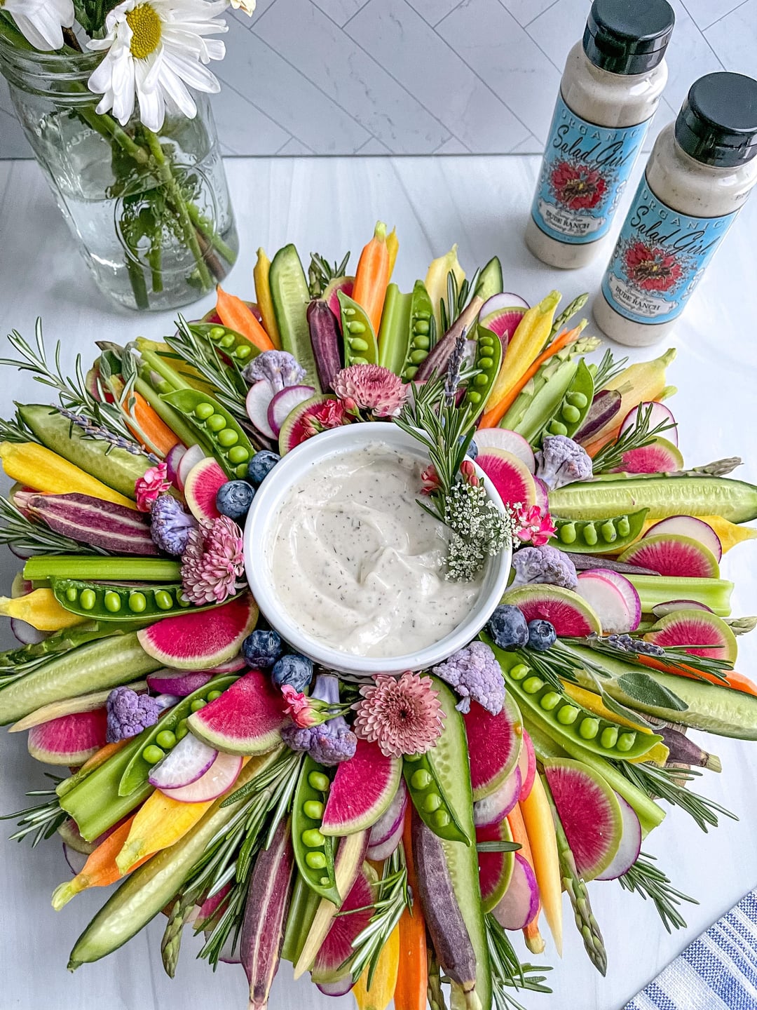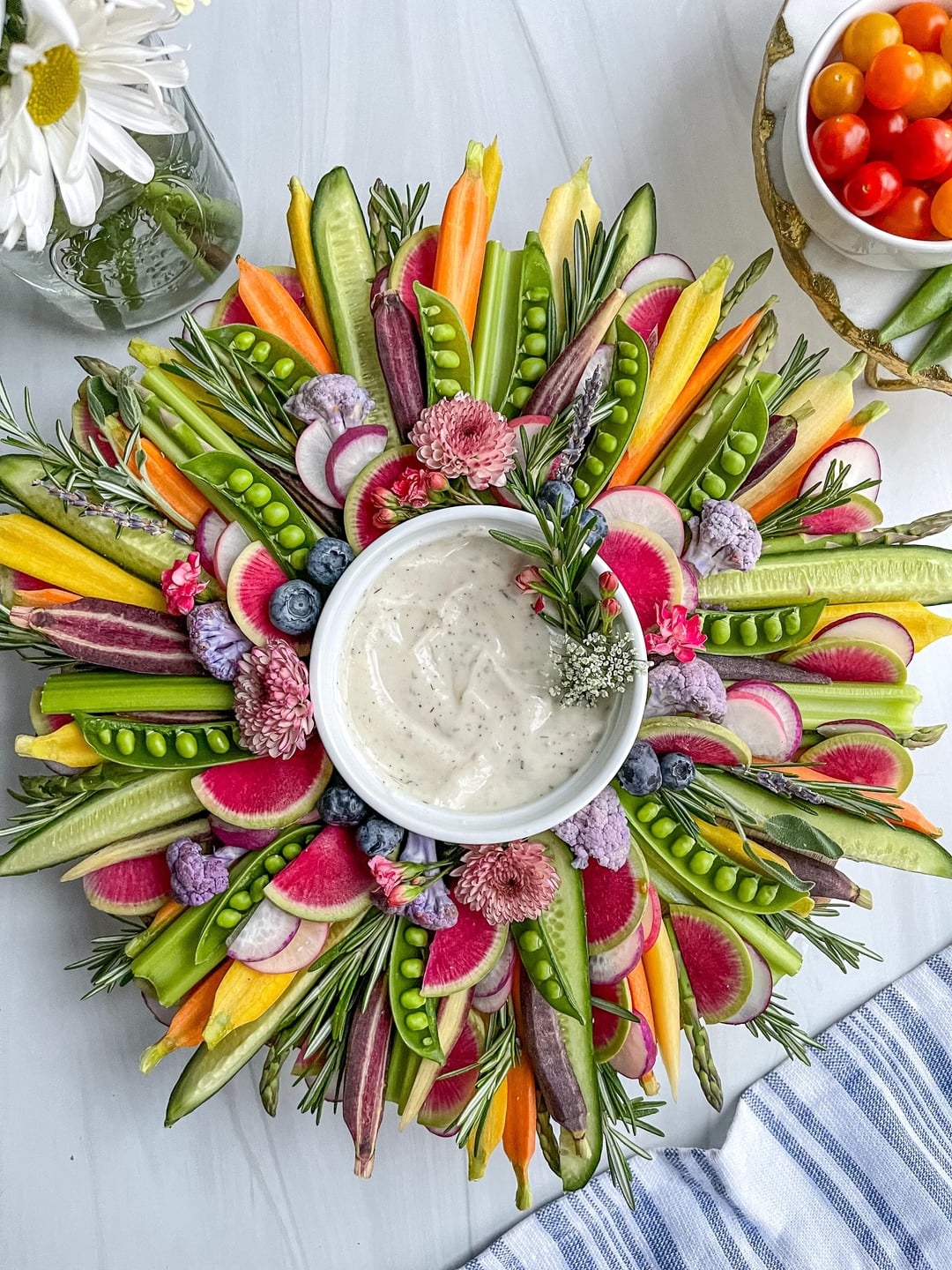 This is my kind of crudite…beautiful work!! Couple questions: Are the flowers also edible and what kind of dip?
