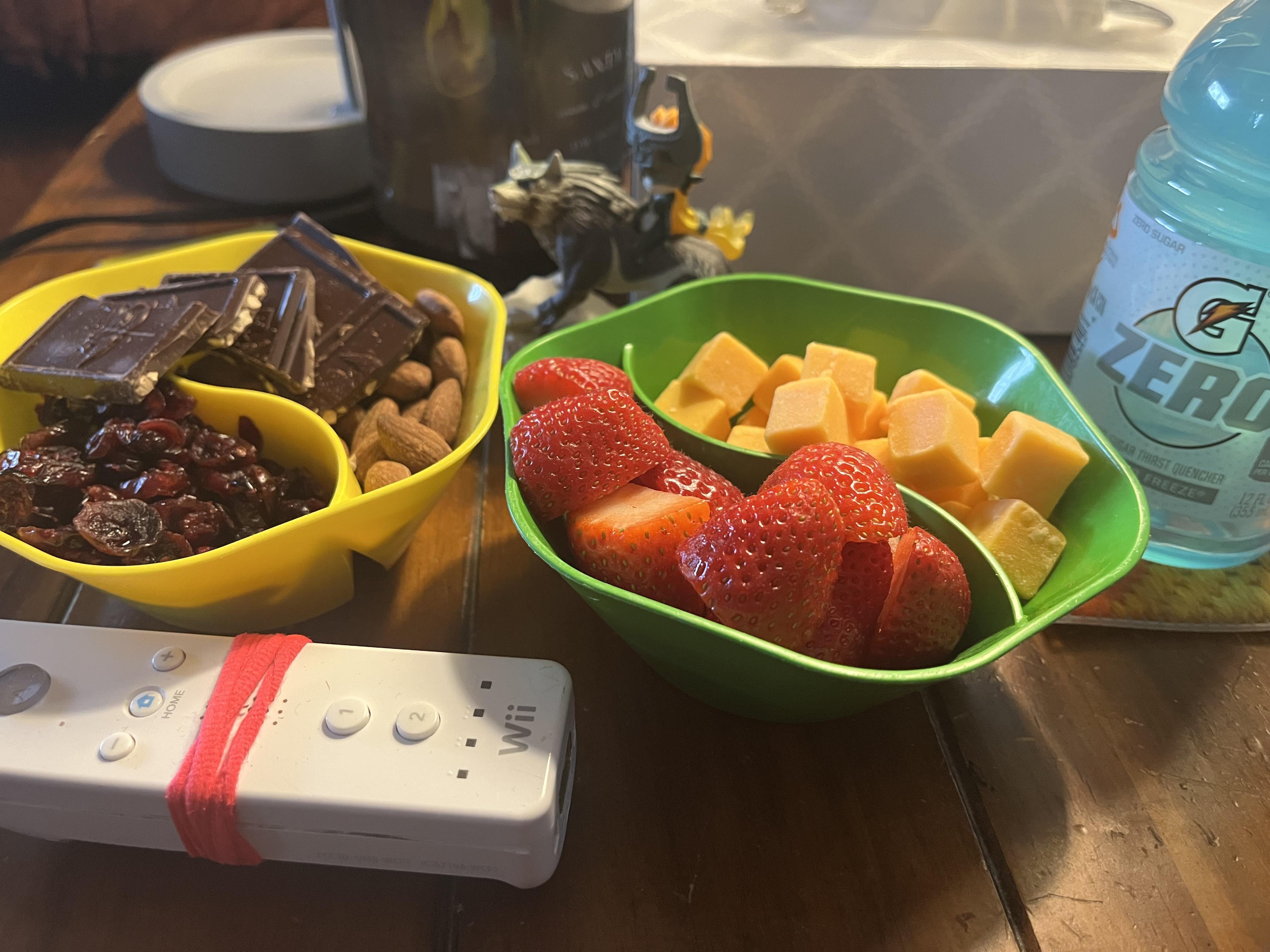 new invention charcuterie bowls. made with cheese strawberries almonds chocolate with almonds in it and craisins. wiimote, gatorade and wolf link amiibo optional by cougoose Charcuterie Charcuterie Board