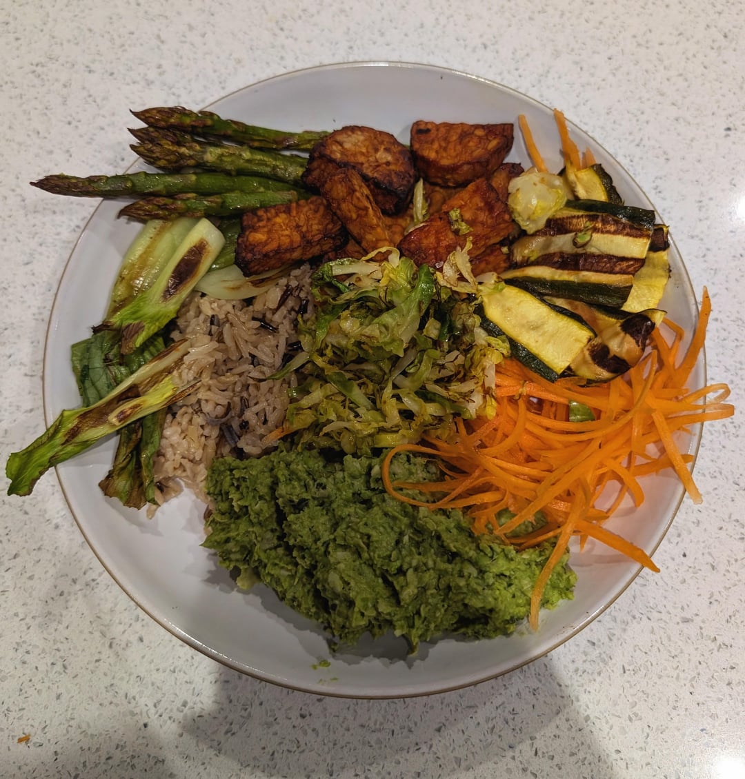 Tempeh Rice bowl with pea and bean dip, griddled veggies with lemon and shredded carrots. Packs a lunch with 38g Protein thanks to the tempeh.