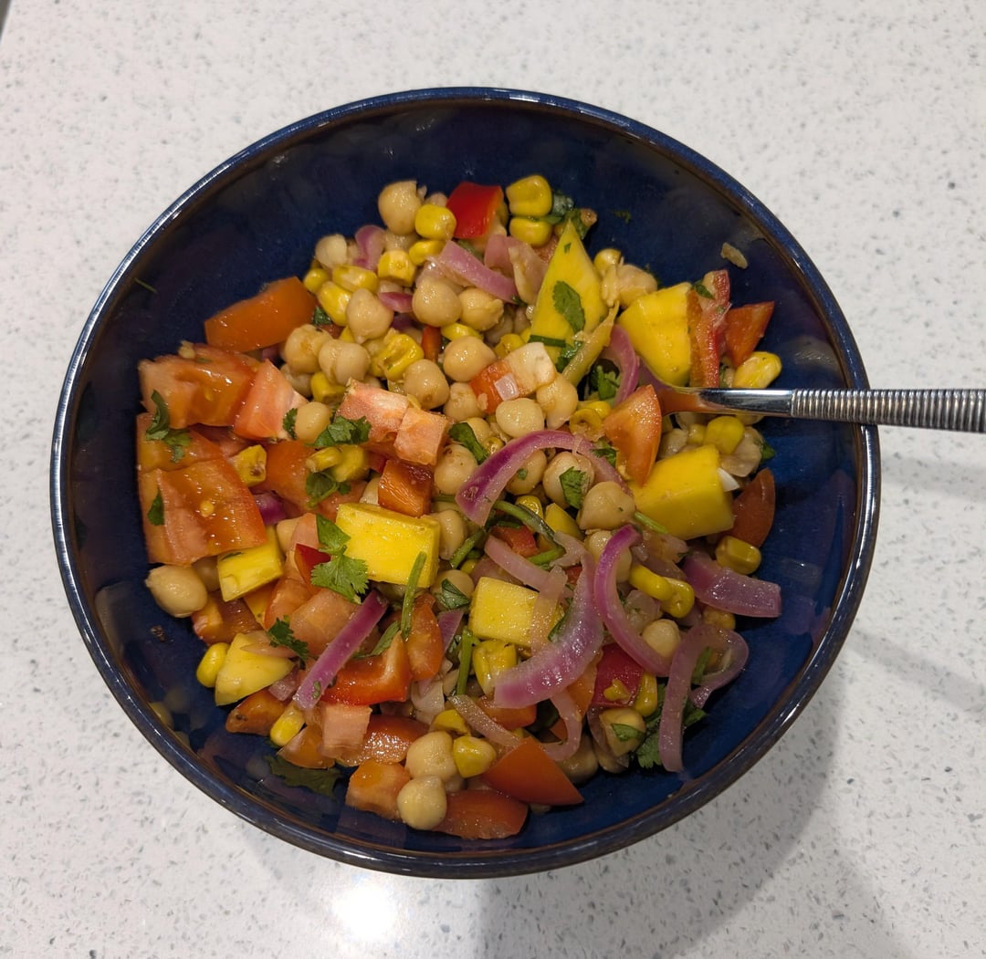 Mango chickpea salad bowl, with quick pickled onions and roasted corn with ancho chill chilli flakes, cumin and lime. I was in a rush, next time I'd chop everything up much smaller.