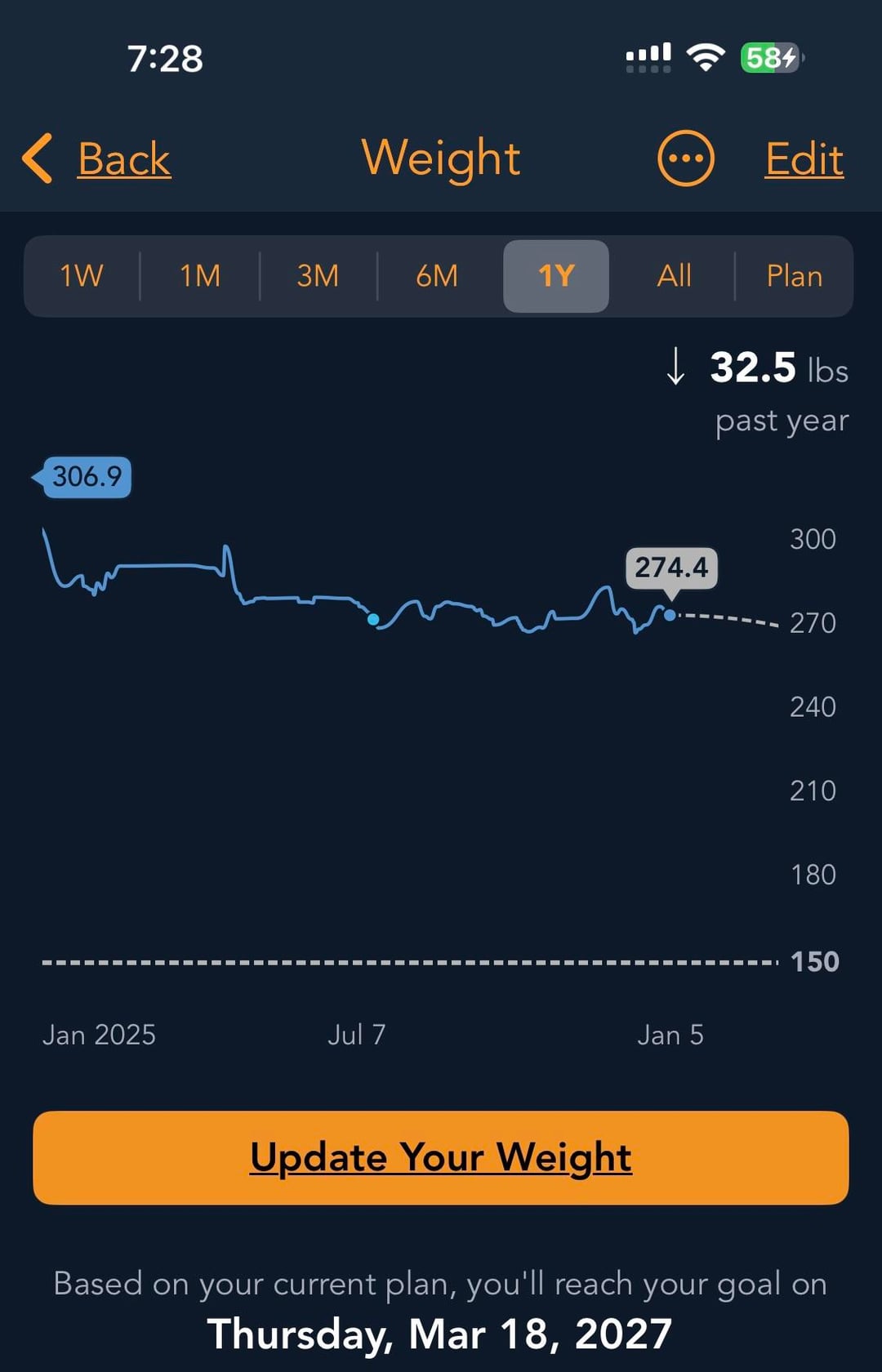Lost 32.5 pounds in a year doing this calorie deficit lazily but now it’s reset time and sticking to the plan. Only 100 to 120 pounds to go. What’s hard is I’m 4’ 11” and have some medical and mobility issues which is why I’m doing the 1200 calories per day.