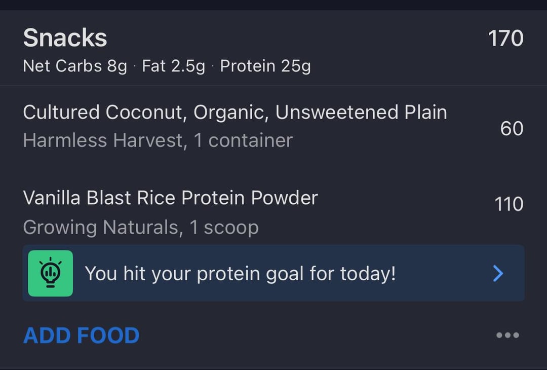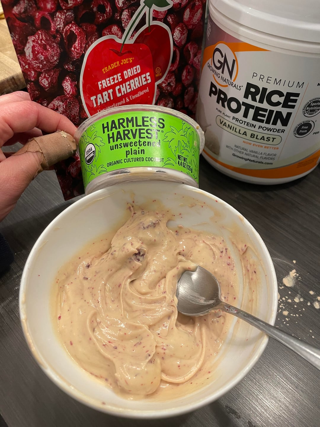 Wanted a quick low-cal snack to hit my protein goal before bedtime, since my dinner had no protein in it. I was also craving something sweet. So….I put protein powder and some freeze-dried cherries in my yogurt and popped it in the freezer for like 20-30 min. Kind of tasted like ice cream, honestly! Maybe a sliiightly less nice texture, but still good.