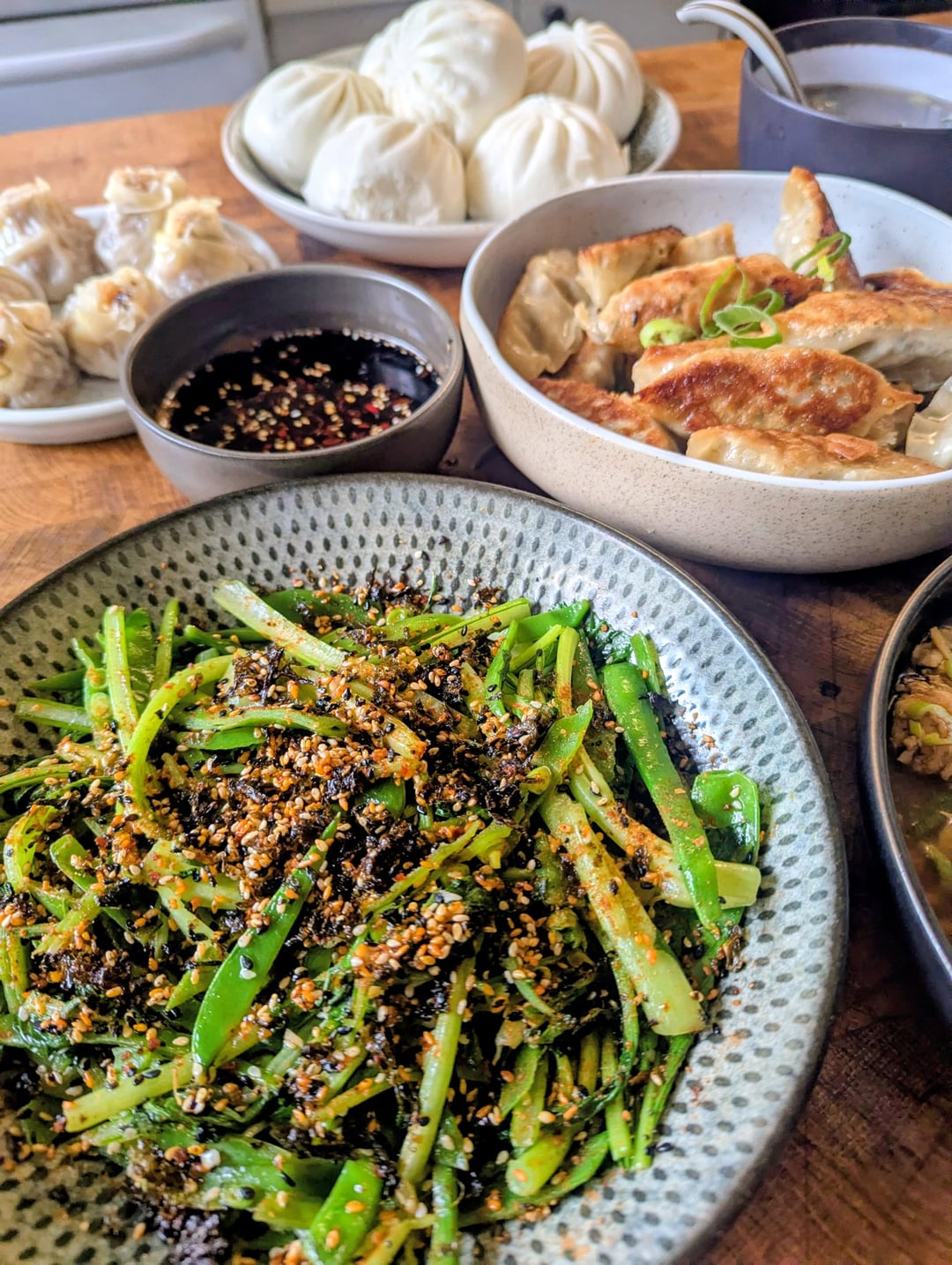 We have steamed mushroom and pickle bao, steamed shiitake moneybags, sauteed greens with furikake and togorashi, pan fried mandu, yuzu soy silken tofu, black vinegar dipping sauce, and kombu broth.
