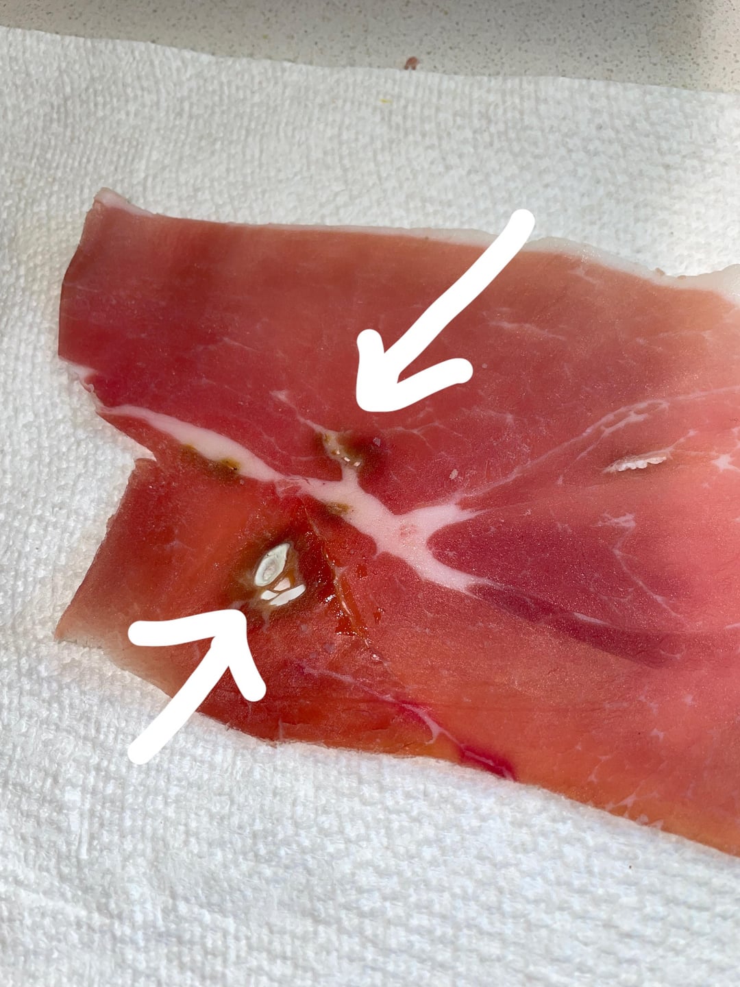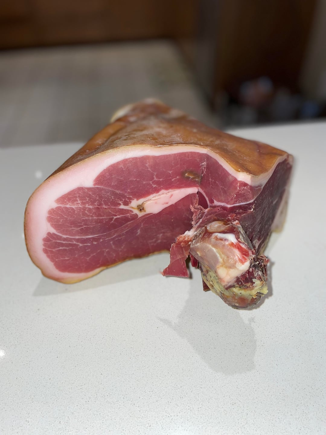 There are few spots where there has been some air intrusion inside the leg that has caused discoloration (veins or arteries?). (See second picture.) Any idea how to avoid the air intrusion in future prosciutto endeavors?