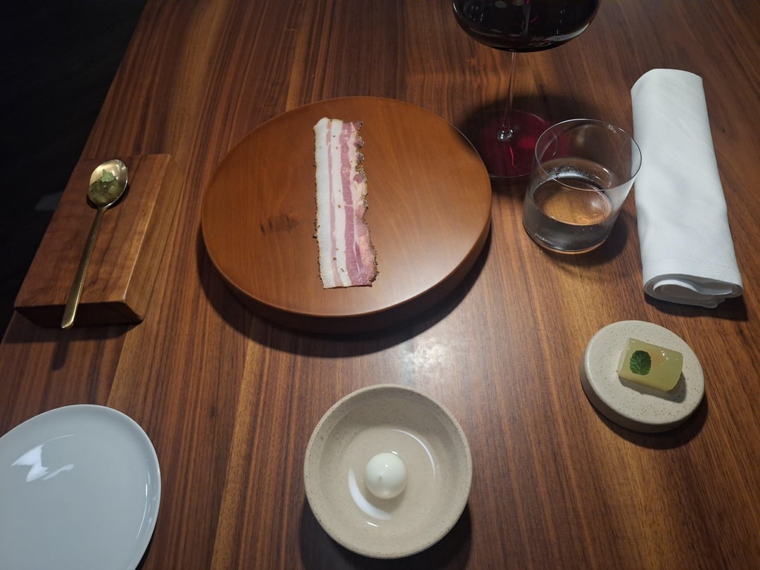 1. Gift from kitchen: fresh mozzarella ball, aged pork belly, relish, and melon marinated in a liquer (I unfortunately don't remember the name of the melon or the liquer – I hadn't heard of either before).
