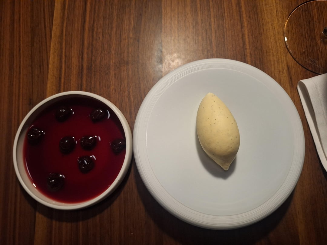 The venison was maybe the weakest part of the meal, but still quite good. The cook was great and the dolceforte was good. I do question the use of blackberries – there were only three and they were tiny (at least compared to the blackberries I'm used to in the US). It was about 6 bites of meat, so you're couldn't get a piece of fruit in each bite, and even if you did have a whole blackberry with a bite of meat you couldn't taste it. The vegetable skewer was also good and the smokiness complemented the dolceforte very well.