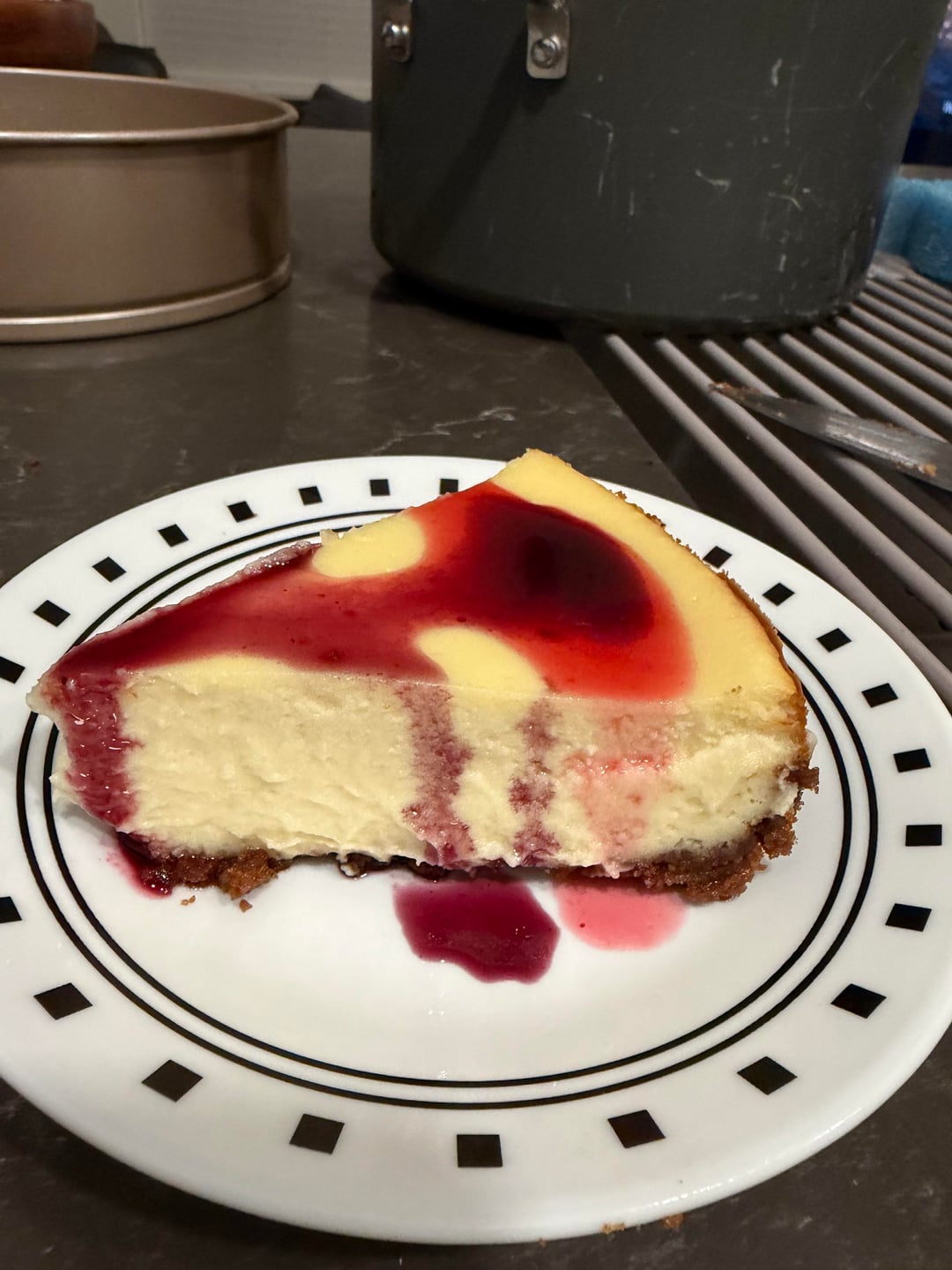 The last pic includes a slice of both raspberry and blueberry syrup I made from fresh fruit. The cheesecake and syrups were still warm so the syrup seems a little runny. Great flavor and texture.