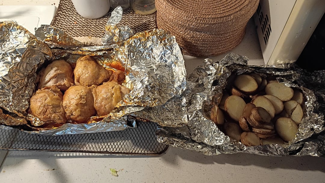 Barbecue Chicken thighs, roasted potatoes, Mac and cheese, and regular mashed potatoes with a cesser salad. by Traditional-Spare154 Dinner Tonight Tonight's Dinner