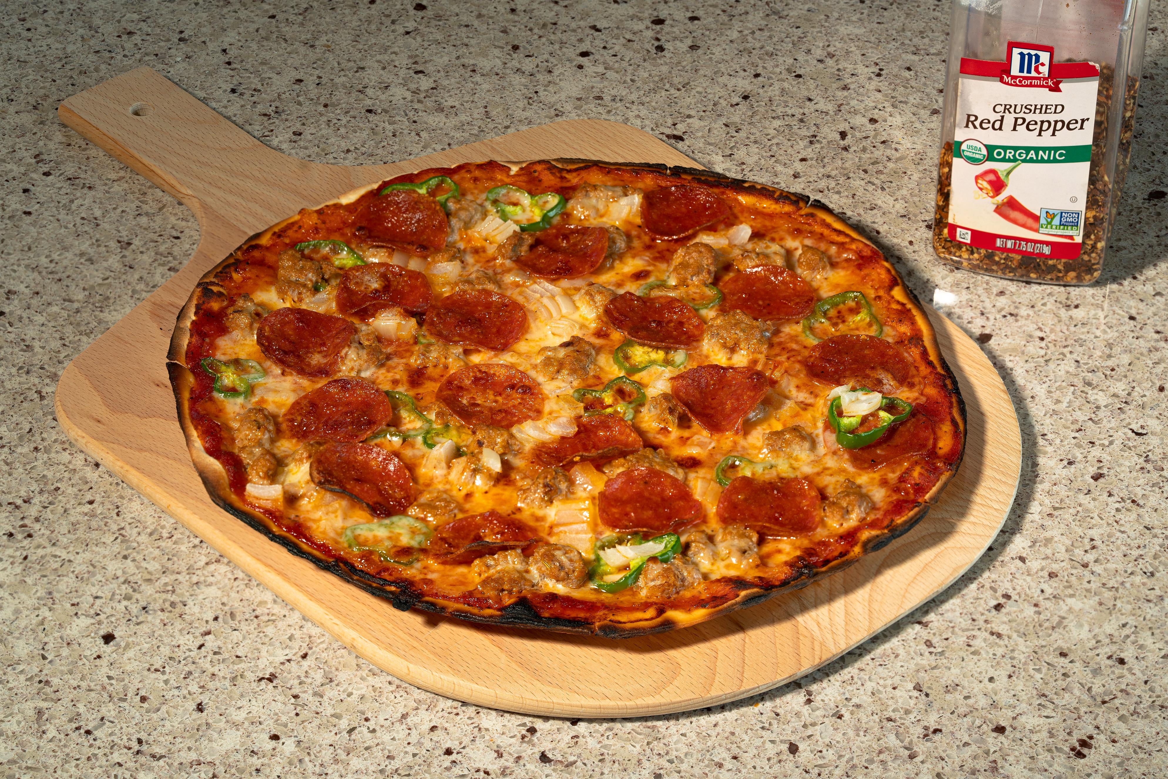 Brian Lagerstrom tavern-style pizza dough recipe. 20g cold butter cut into 180g flour, mixed with 2.5g yeast, 3.5g salt, 90g cold water. Kneaded for a couple minutes, proofed for 2 hours, rolled out to 12" then docked and cured in fridge for 24h.