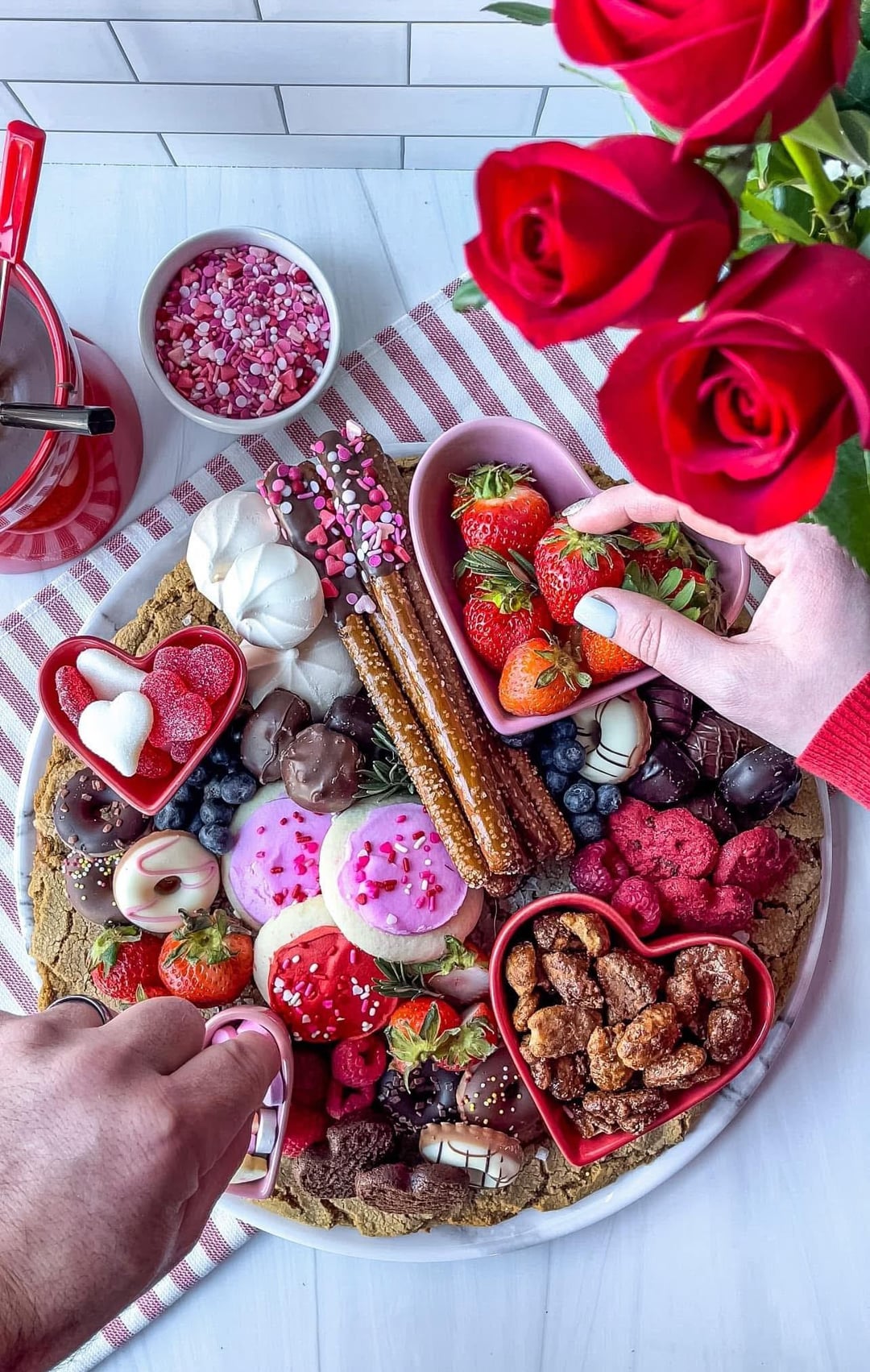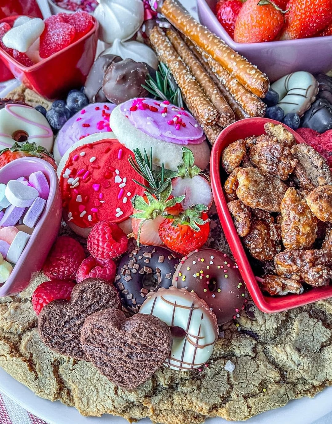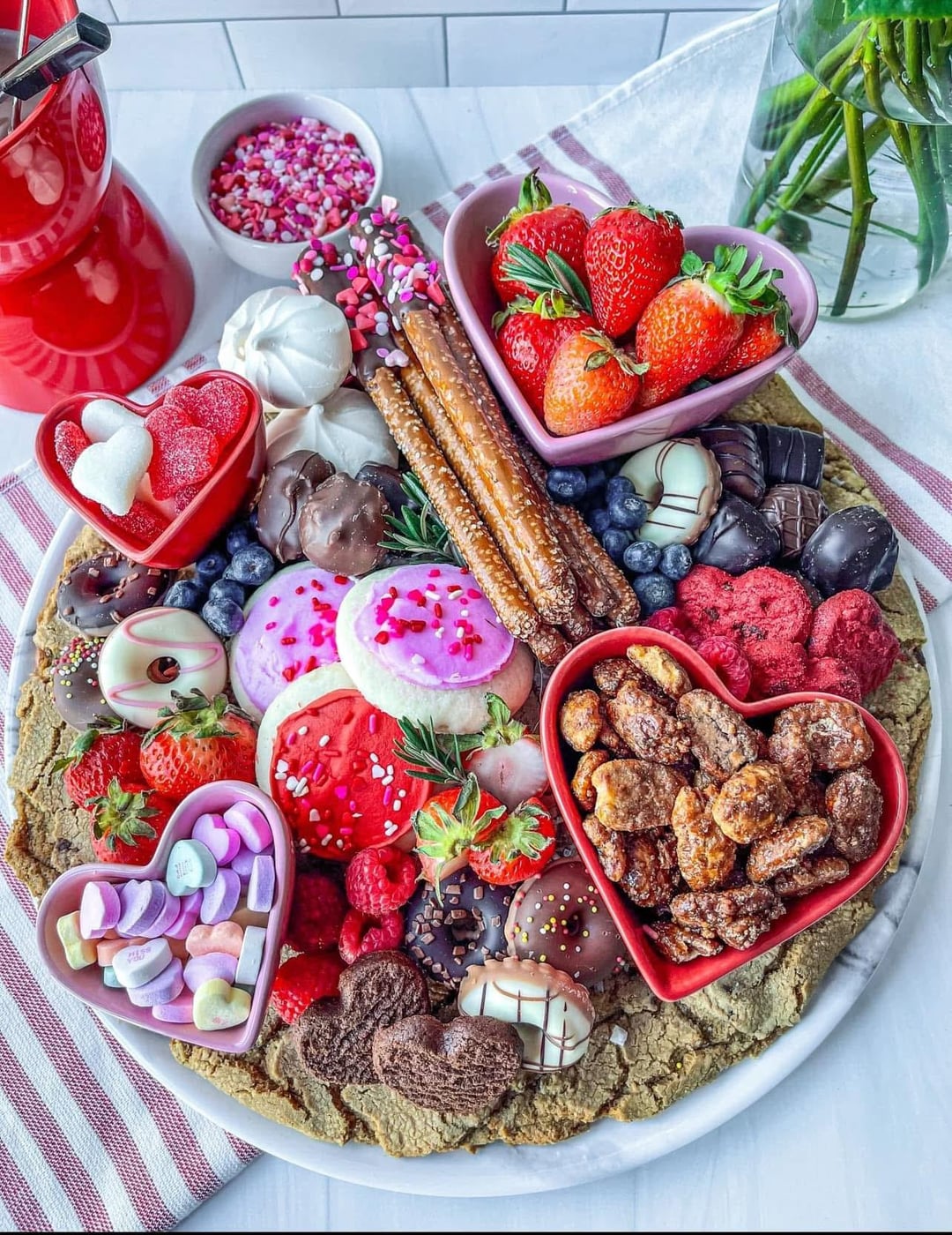 Made a chocolate fondue spread on a giant chocolate chip cookie šŖ this was for Valentineās Day a few years ago. So fun that you could actually eat the āboardā when you were done š„°š©· by TheBoardLoon Charcuterie Charcuterie Board