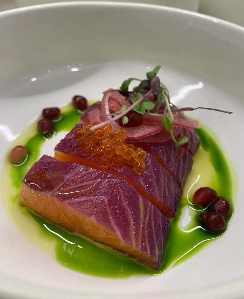 Gin and red cabbage cured salmon herb oil and pomegranate by Ancient-Butterfly-75 Culinary Culinary Plating