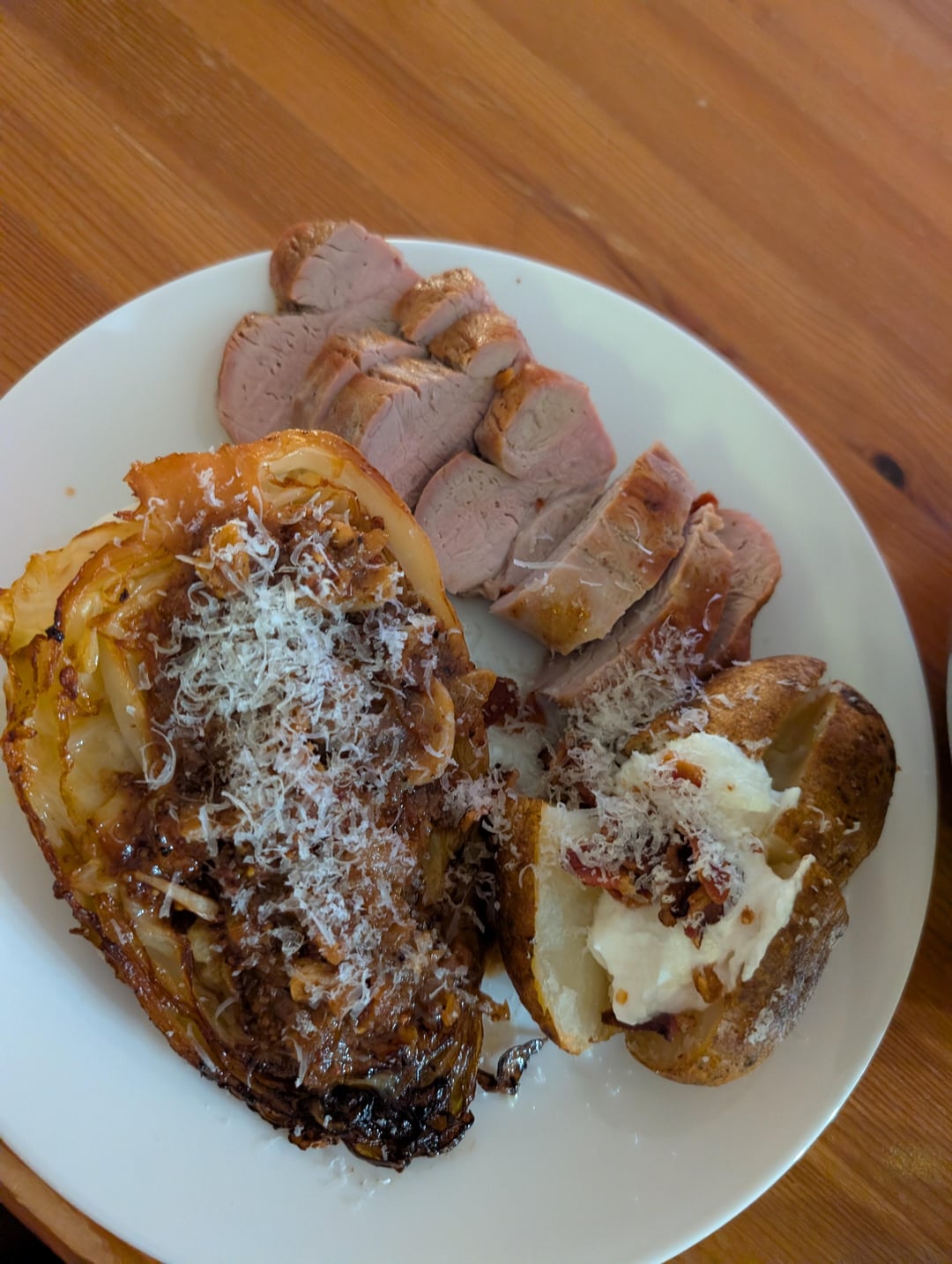 After the pork loin was done I deglazed the pan with white wine, grain mustard, garlic, shallots, butter and cream. Coated the cabbage with this sauce and added grated Parmesan.