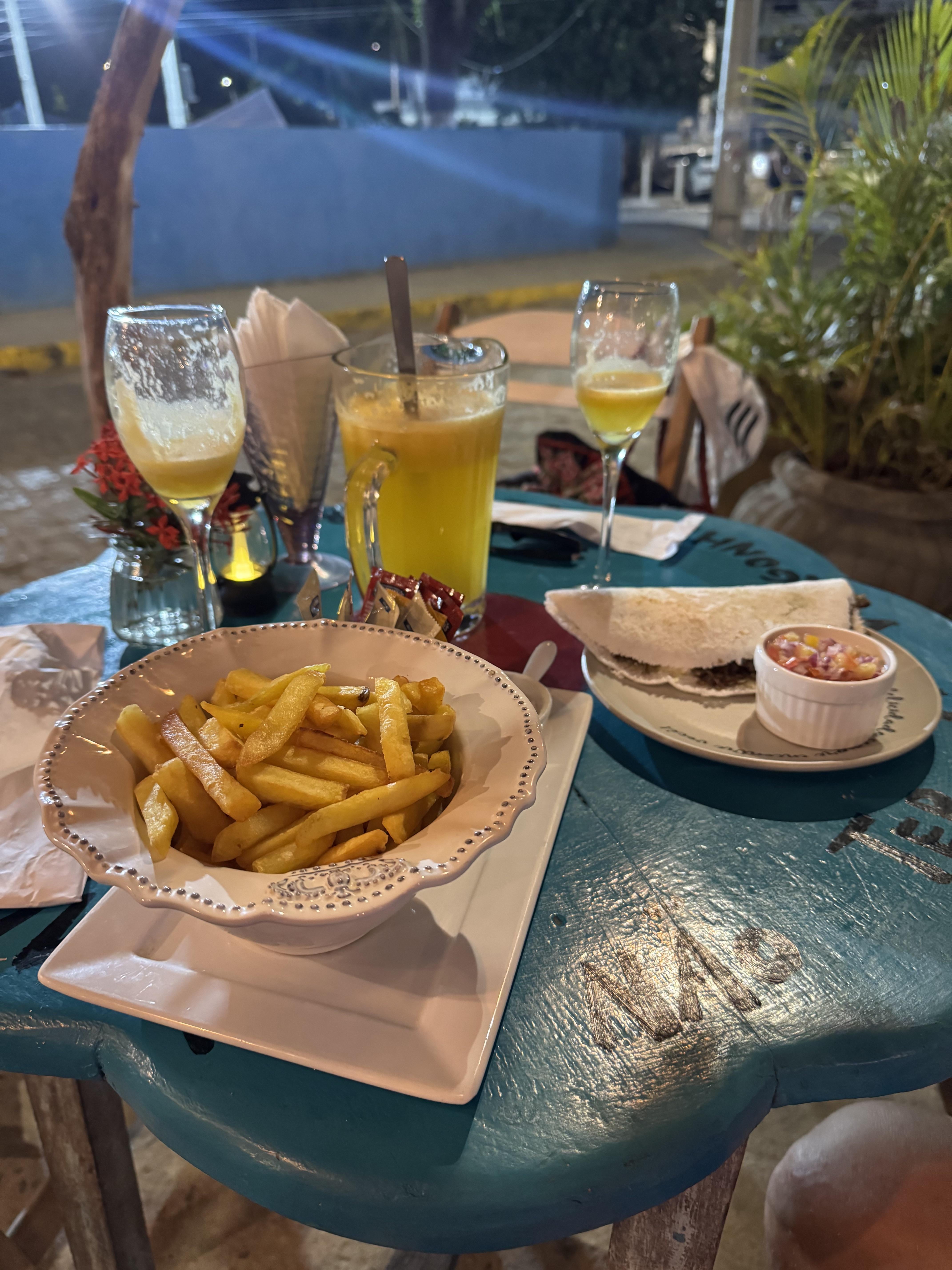 Simple, delicious, and very easy to make… In this photo, we ordered a very generous portion of potatoes (very tasty and crispy), and we tried something very typical of Brazil for the first time: tapioca. It's very easy to make; you buy the mix at a market and just mix it with water. It can be sweet or savory. In this photo, we ate it with shredded beef and what in my country we would call "salsa criolla." Have you tried it?