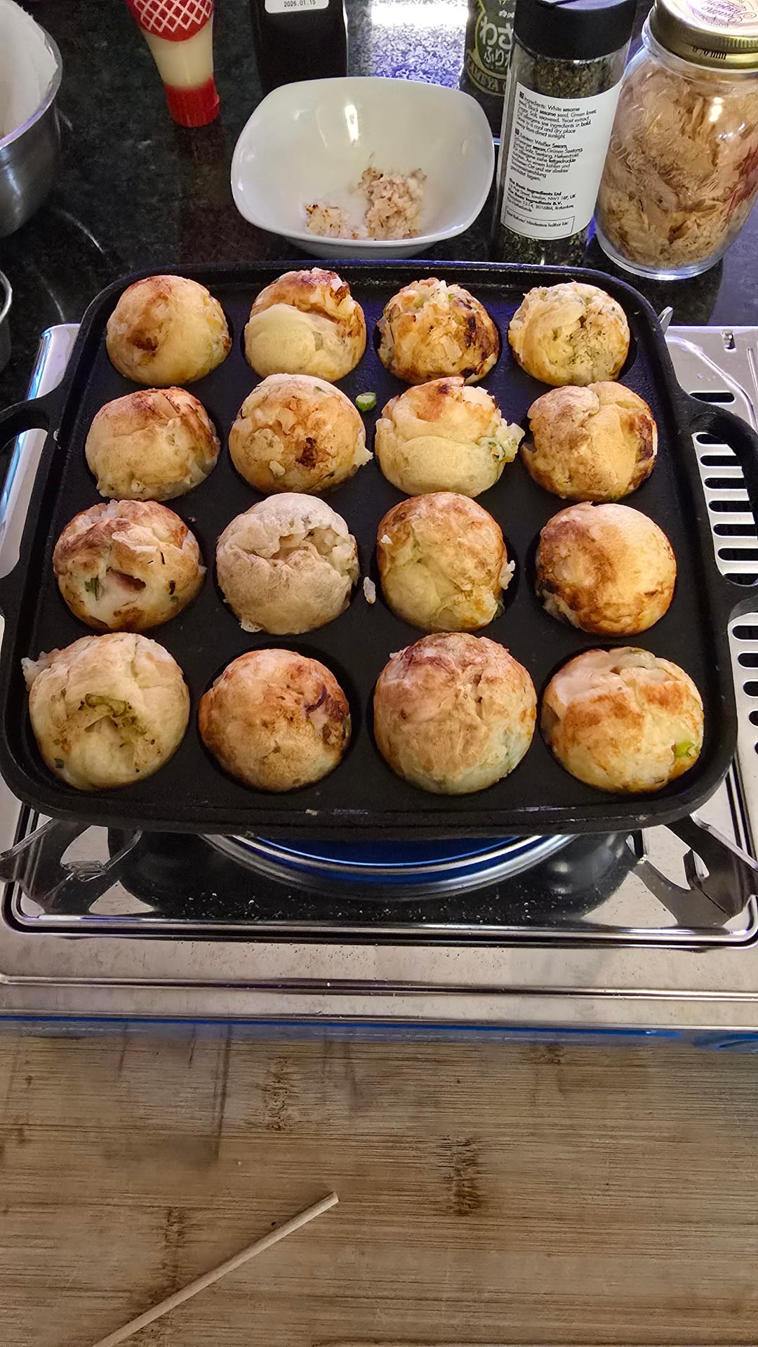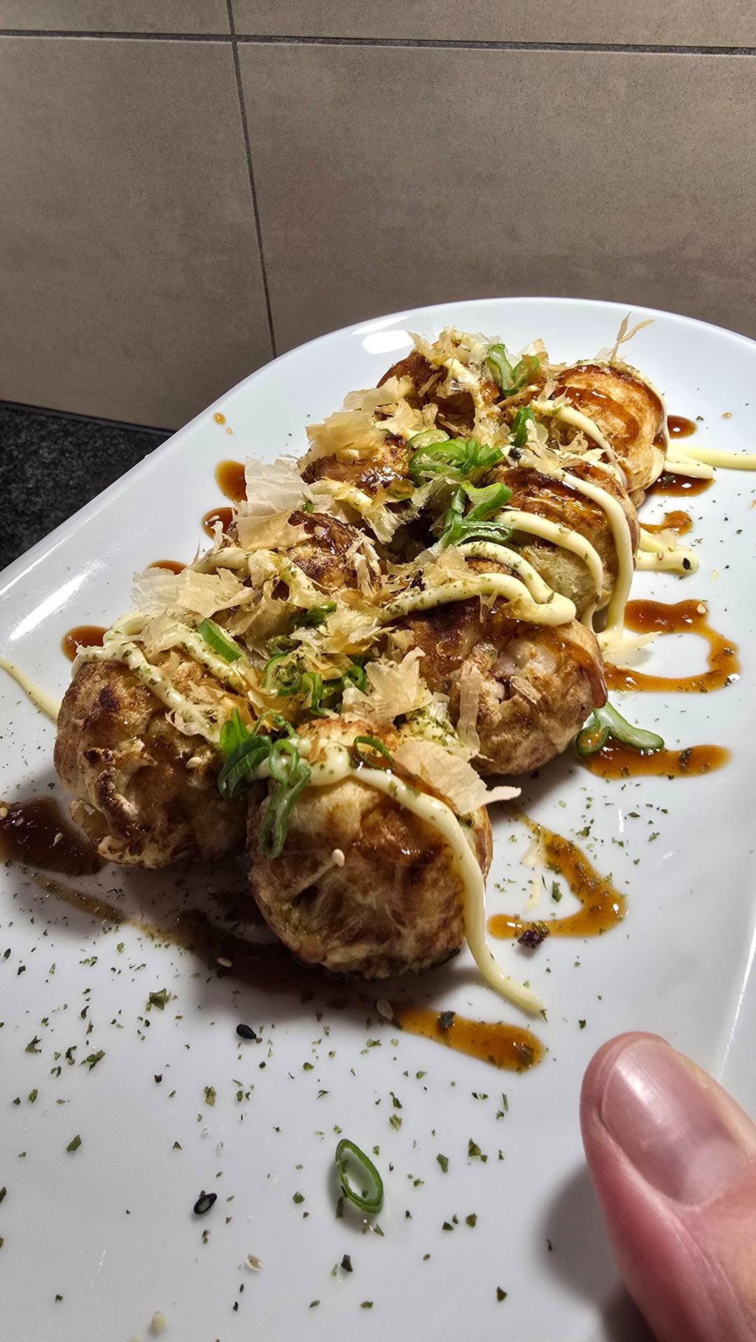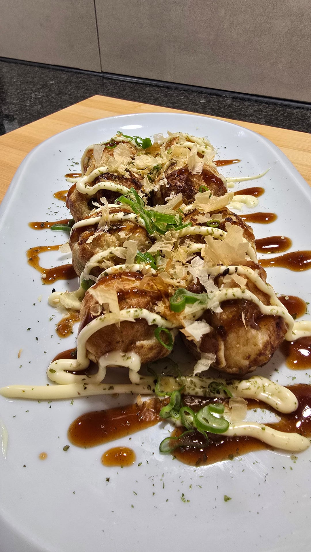 I bought the dry batter from Otafuku and mixed it with water and an egg. For the filling, I used octopus and spring onions. The toppings included Kewpie mayo, takoyaki sauce, tuna flakes, seaweed, sesame seeds, and spring onions.