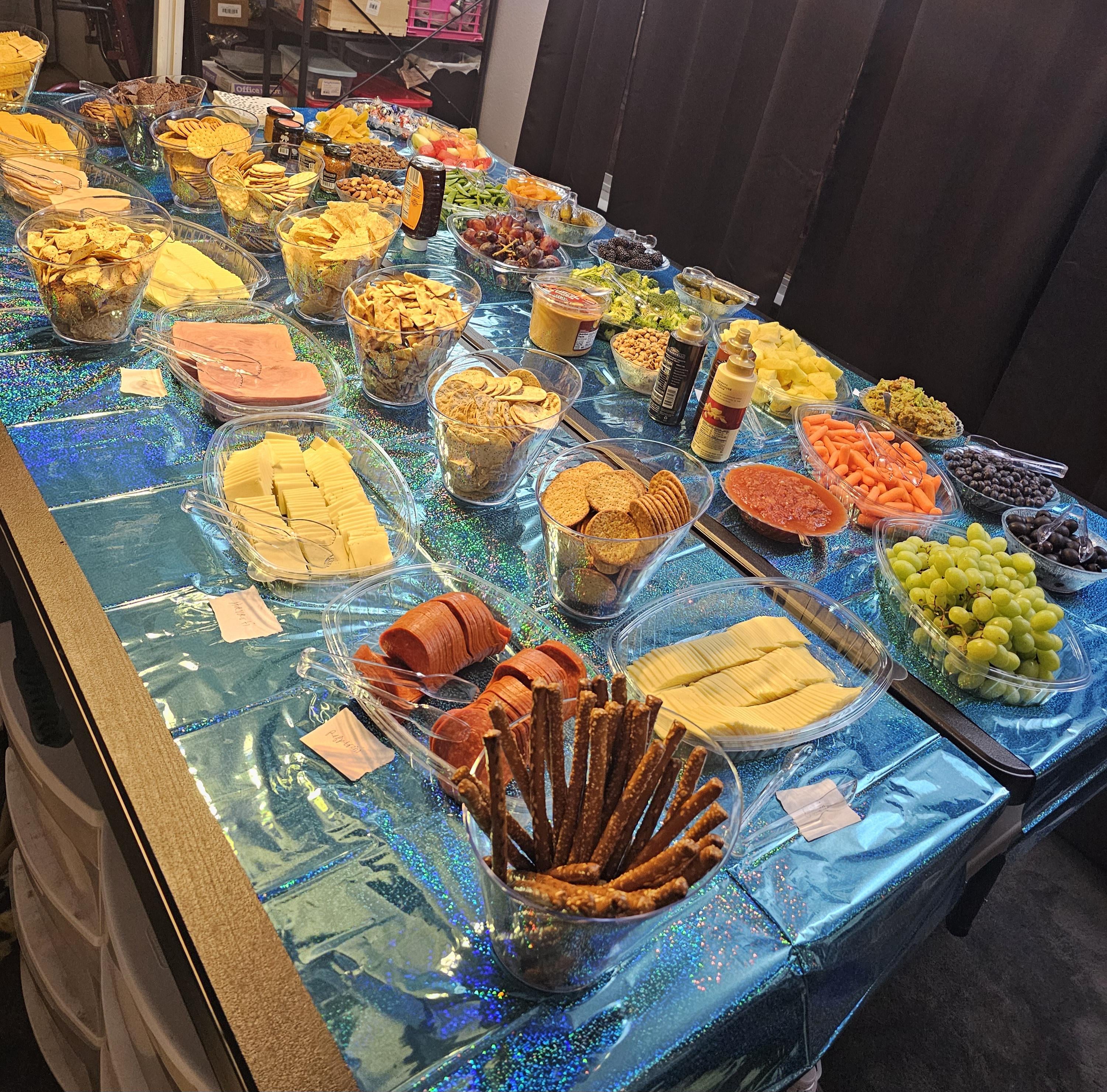 My idea for a jumbo charcuterie board turned into a giant grazing table! Two 8ft tables of meats, cheeses, etc. It was the star of the party! by Tamityville-Horror Charcuterie Charcuterie Board