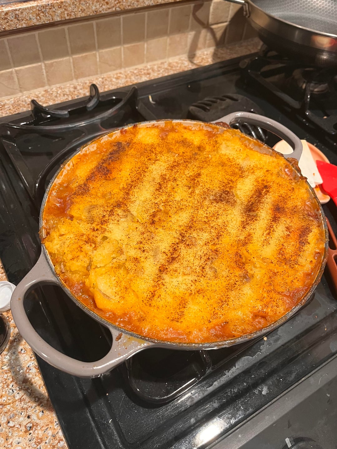 Used this [recipe](https://tastesbetterfromscratch.com/cottage-pie/) as a guide: I only used ground beef, frozen veggie mix and had a quart of mashed potatoes leftover from Thanksgiving. Paprika on top.