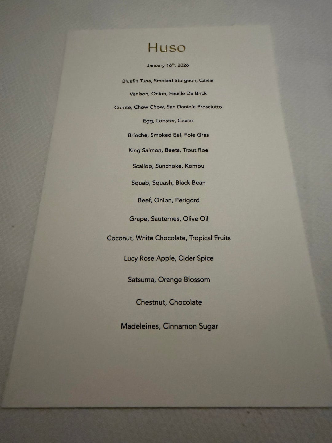 Very good but not great. Overall I enjoyed dinner at Huso. The restaurant is beautiful and the plating is superb. The first half was excellent, but it went downhill with the last meat dish, a wagyu wellington, and the desserts. Service was excellent. We didn’t do the caviar or white truffle supplements. The course in the kitchen was a nice touch.