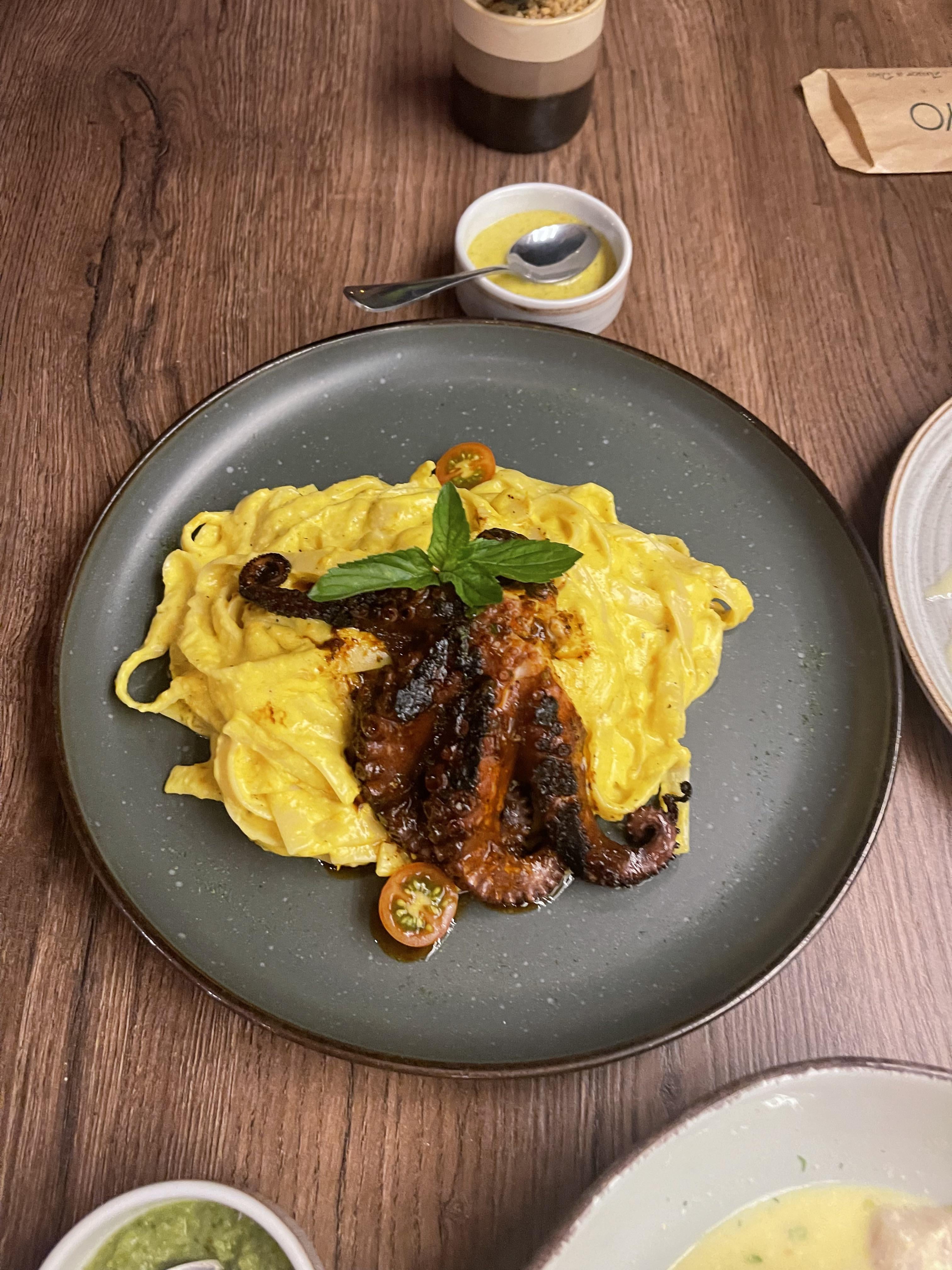 Huanca Pulpo (Pasta in Huancaina sauce with grilled octopus) from El Tramboyo in Huanchaco, Peru by Coldwarkid682 Food Porn