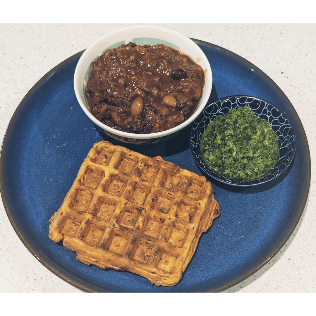 Waffles I took the recipe I shared last week and subbed out the cauliflower for charred frozen sweetcorn and swapped Indian spices for chipotle powder,cumin,garlic,smoked paprika and a squeeze of lime. It was delicious and came together in 15 minutes with waffles and chilli from the freezer.
