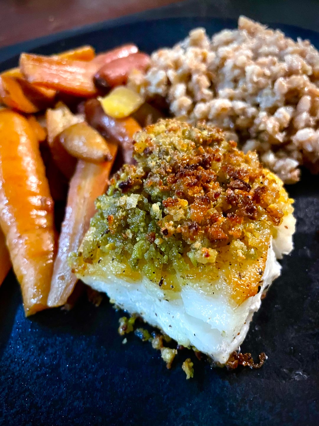 Chilean sea bass, pan seared and crusted with sourdough and pistachio, served with farro and sage brown butter braised carrots with a vermouth reduction glaze