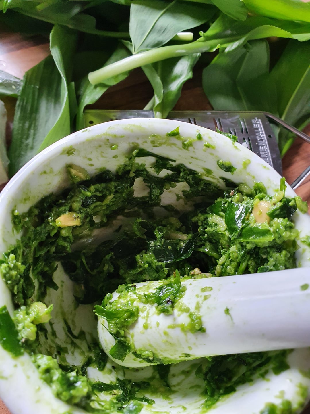 This is one my favourite dishes. I picked the wild garlic myself, grinded it down with some parmesan, Olive oil, pine nuts, salt and a pinch of lemon to get a pesto. With flour and eggs I made some fresh pasta and combined both into this tasty dish.