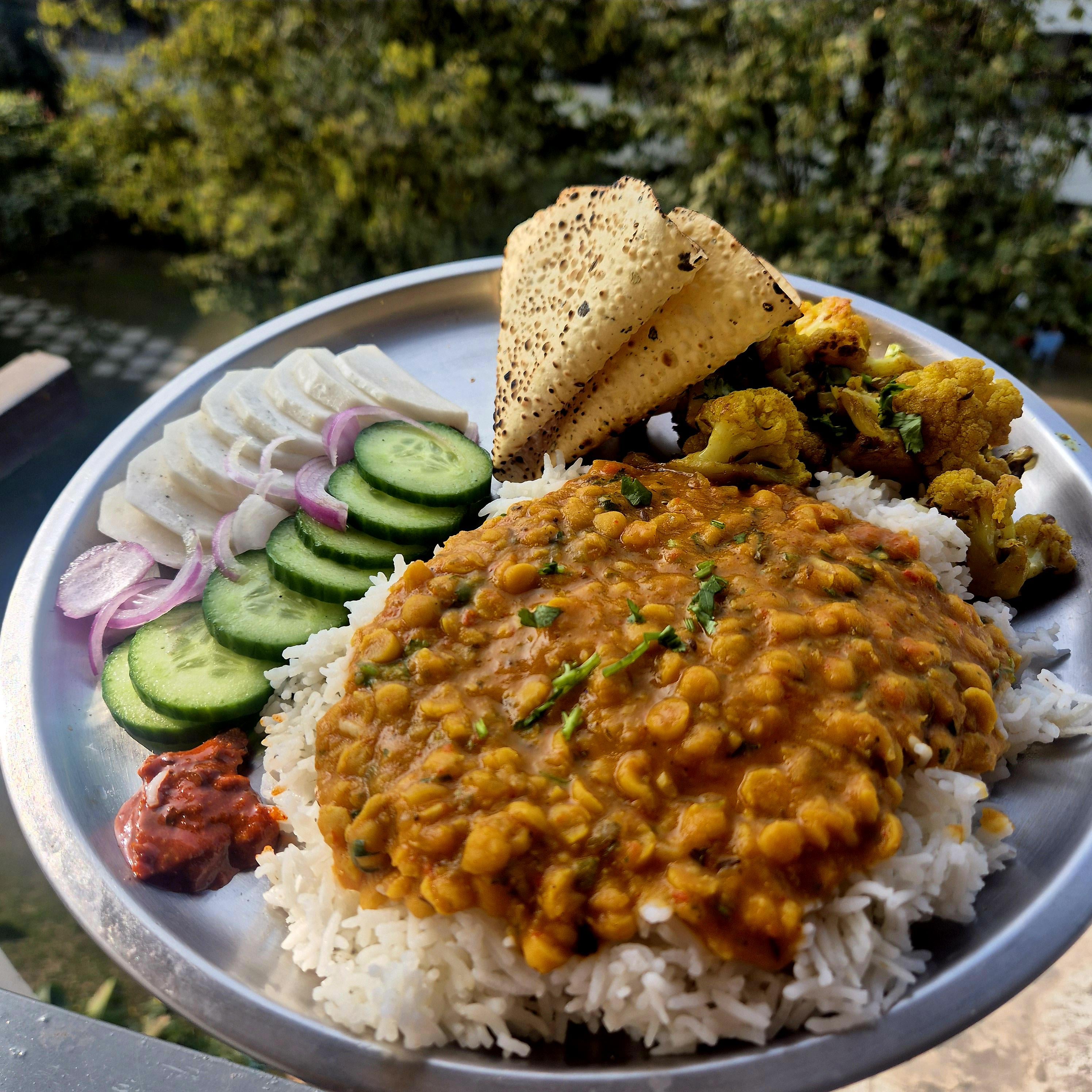 This is home-cooked heaven. Rice for comfort, dal for protein, cauliflower for a sabzi, ie a vegetable dish. Some raw veg for crunch, with black salt on them, some papad (dried lentil chip) for a smokey, charred brittle crunch of a more mouth shattering experience.