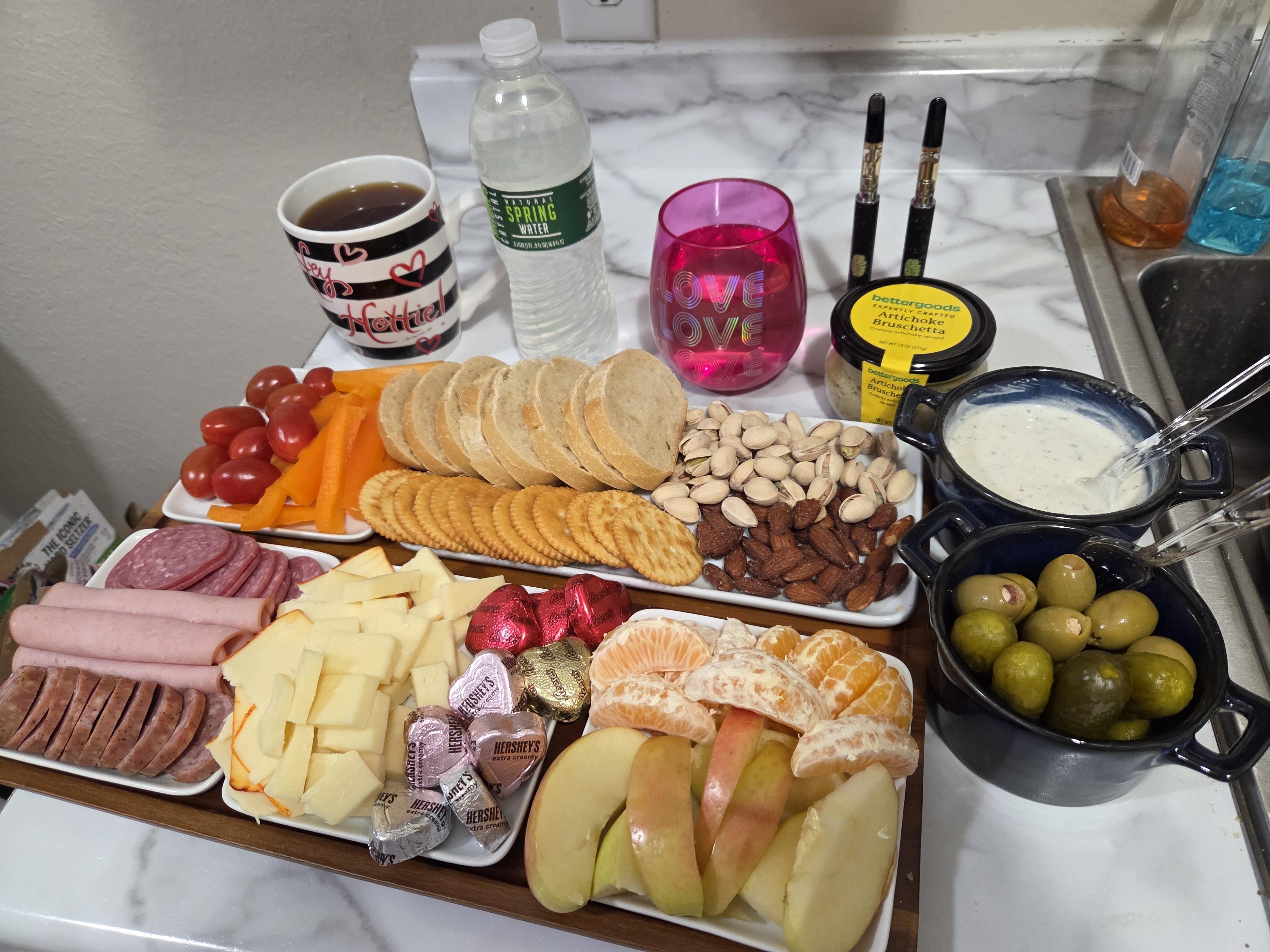 peppers, tomatos, summer sausage, salami, turkey, sourdough, ritz, Pistachios, almonds, cheddar, muenster, apples, oranges, hersheys and reeses hearts (not pictured i have sour Mike n likes too), pickles n blue cheese olives, bruschetta, black tea, lemon water, Riesling. The white dip is Greek yogurt with some pickle juice, lemon, garlic, onion, salt, pepper, and ranch powder.