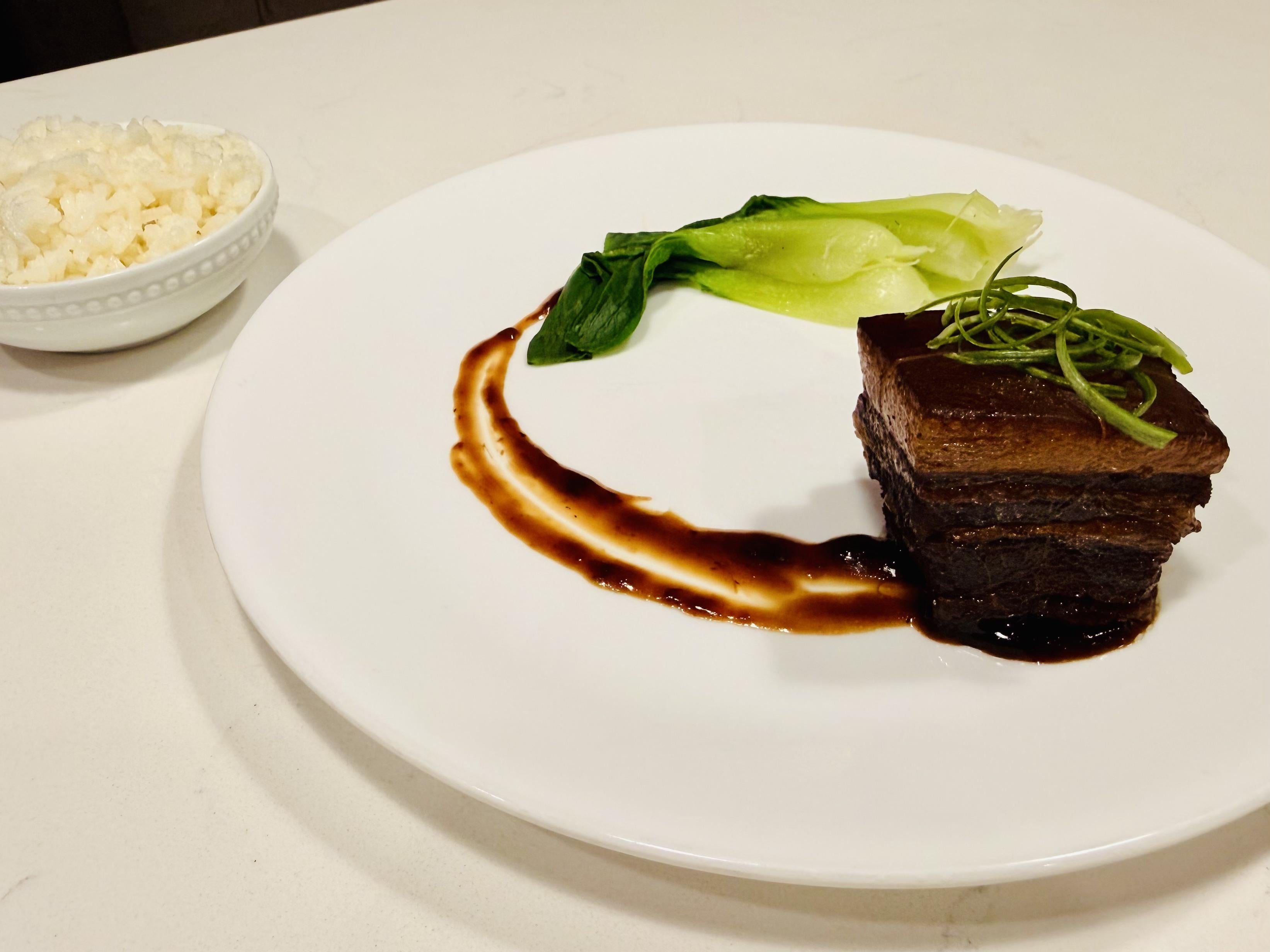 I like the white colour plate you used and the spring onions on top of the braised pork for colour contrast, the bowl of rice at the side, but for a dish that is braised, the amount of sauce you put on it feels a bit stingy (you can also kind of see the sides of the pork starting to dry up a bit).