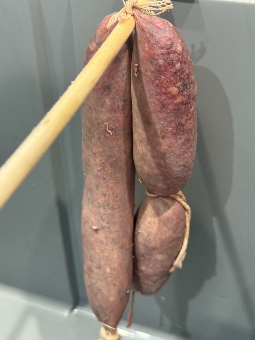 600 or anything as the packet I ordered didn’t arrive until the salami had already fermented (using T-SPX) and I started drying it. I checked back on it today (roughly a week later) and saw the mold in the picture, which definitely looks off. I wiped it down with some vinegar and there are definitely still some problems (as shown in the second picture). Now that I have some Mold 600 should I throw this batch out and make a new one and inoculate it with the Mold 600 to try to prevent bad mold like that from showing up? (Or maybe cold smoke it instead?) I’m thinking either the chamber was too high humidity (my temperature probe read 55F, 80% H, though it seemed a bit higher) or just mixing a duxelle in with the salami messed with it? (Maybe it didn’t get dried out enough and there was still some vegetable oil from sauteéing that got mixed into the salami? Would oil have affected it like that?) thanks!