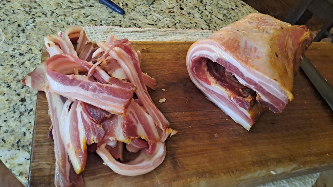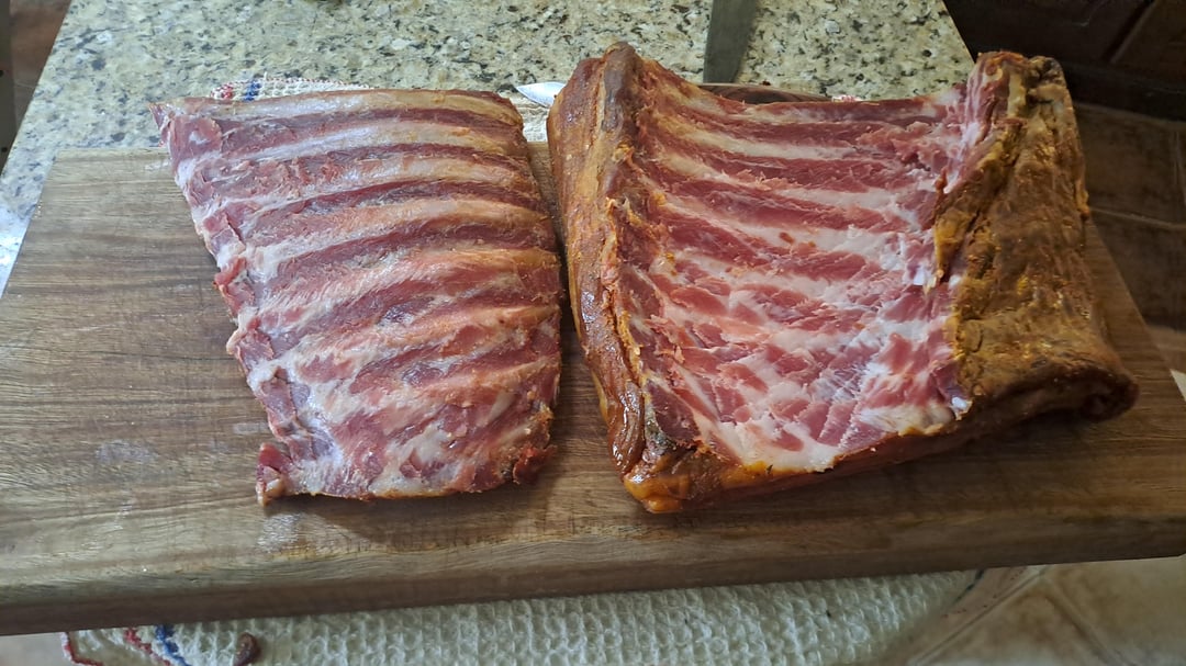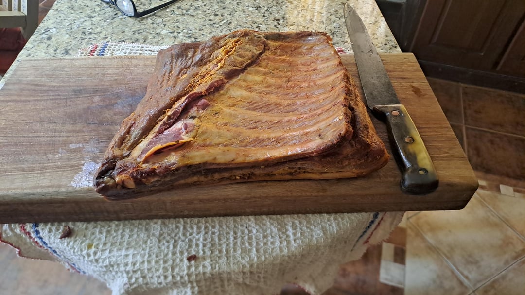 Note: First time curing the belly with the bones. I much prefer it this way. It allows for slower curing. When the ribs are removed, the texture of the meat is fantastic. Without the bones, it would harden a lot while hanged.